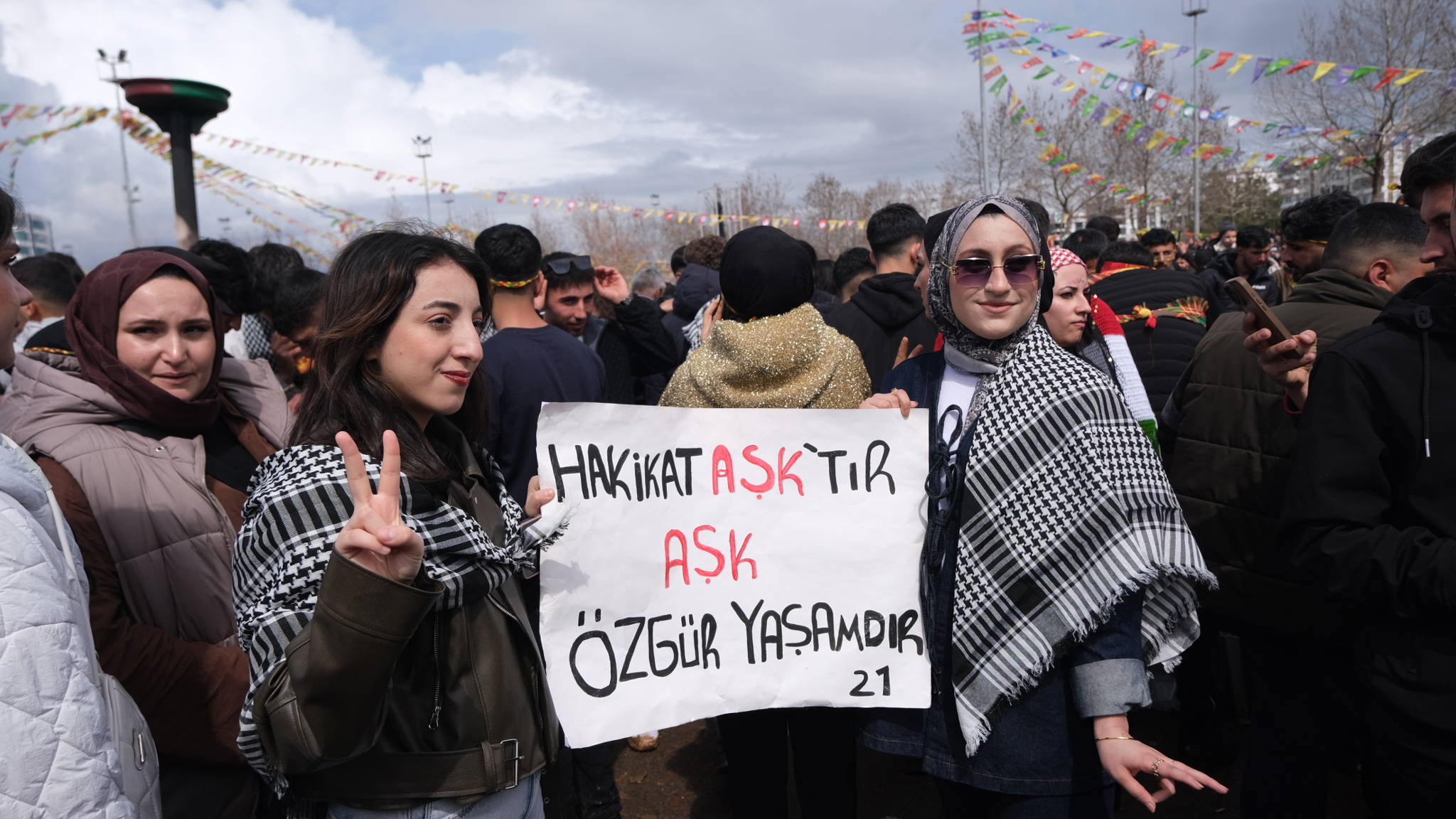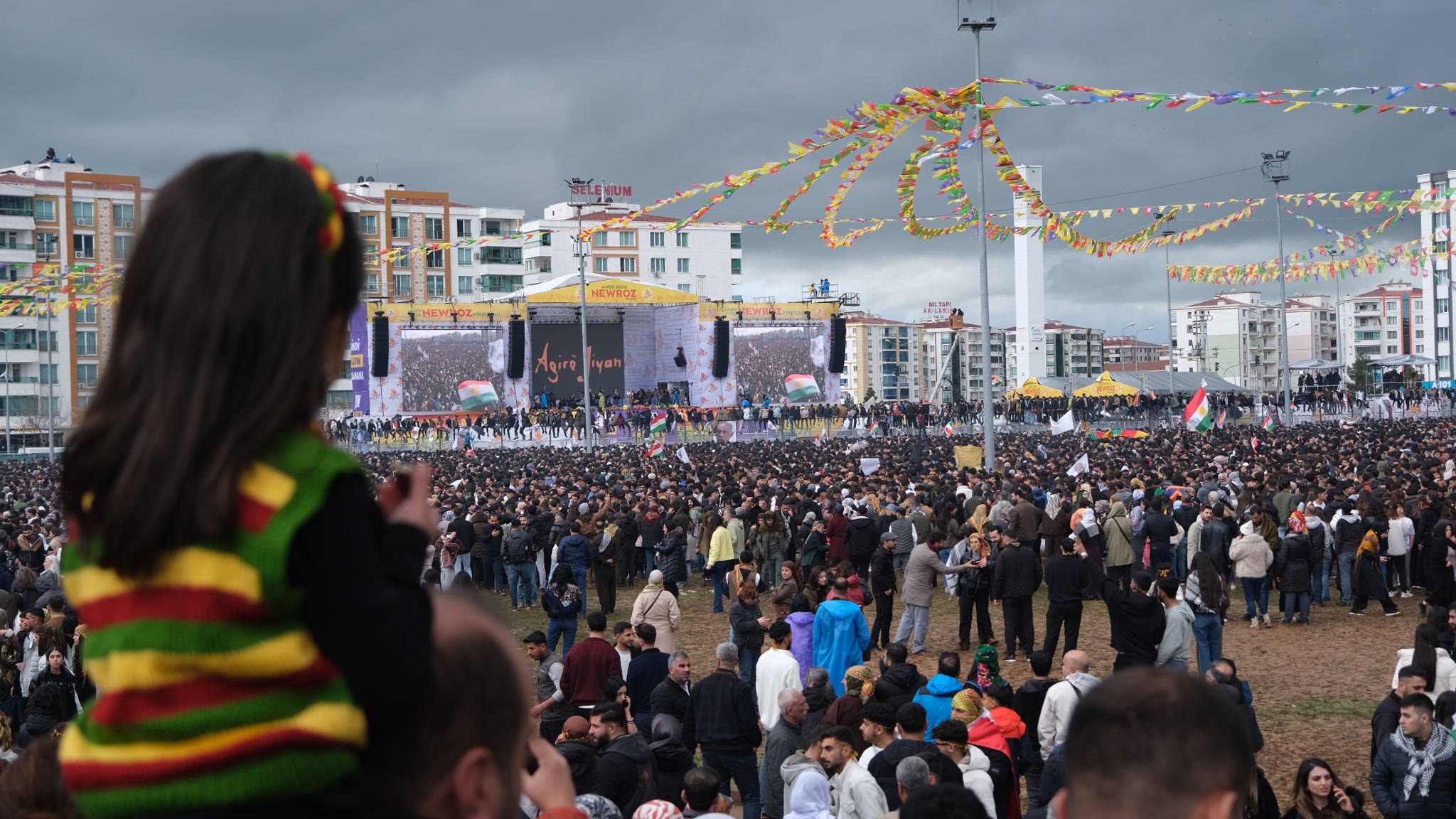 Diyarbakır’da 21 Mart günü Bağcılar Mahallesi’ndeki Newroz alanına sabahın erken saatlerinden itibaren akın vardı. Hava koşulları nedeniyle ayrılanlar oldu. Bu nedenle çekilen fotoğrafların hiçbirinin gerçek kalabalığı tam olarak anlatamayacağı hissi hakimdi. Alan bazen boşalıyor gibi görünse de, başka bir kapıdan yeni bir dalga içeri akıyordu.