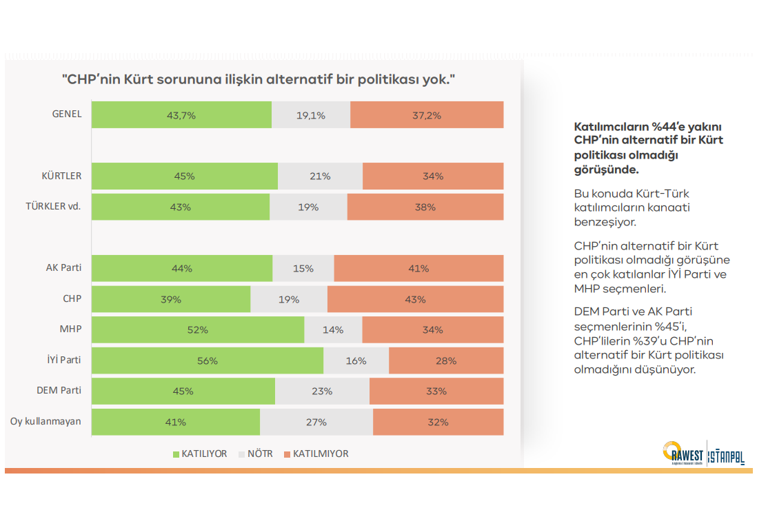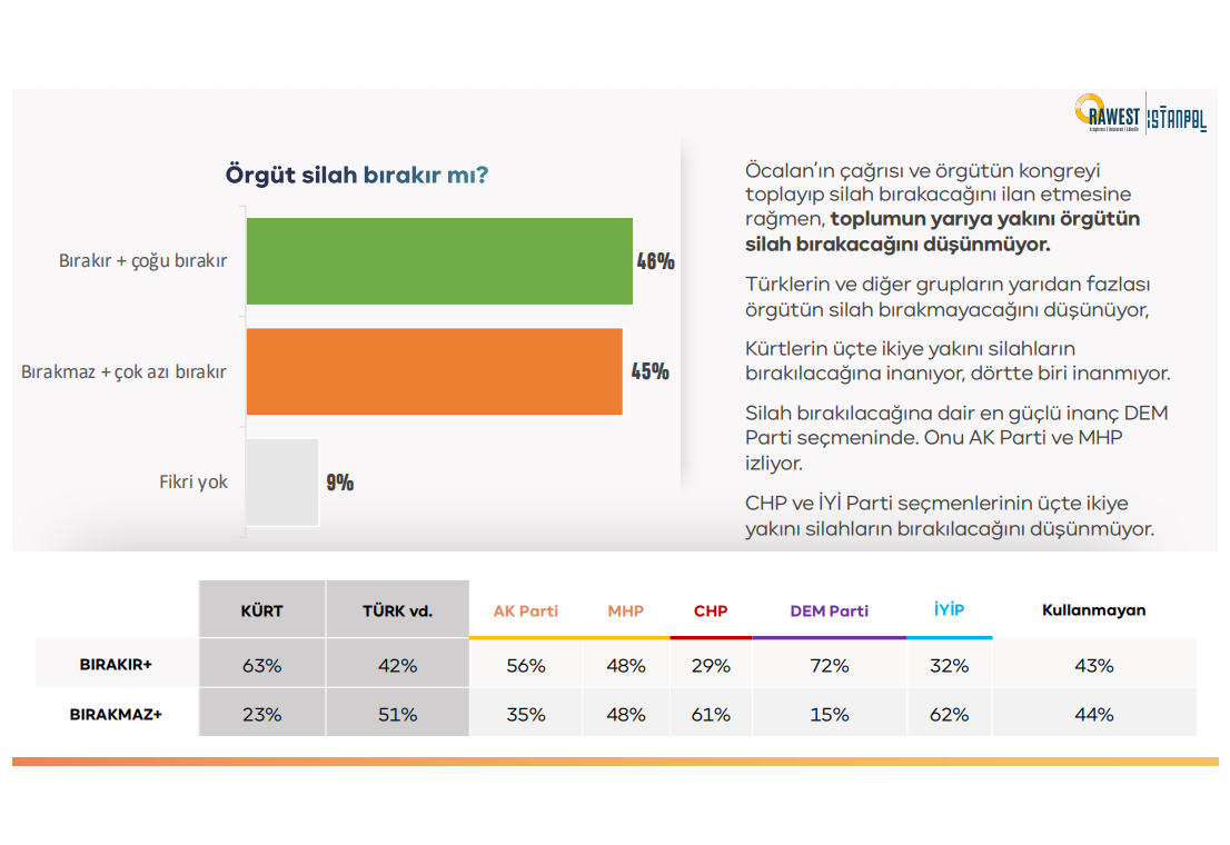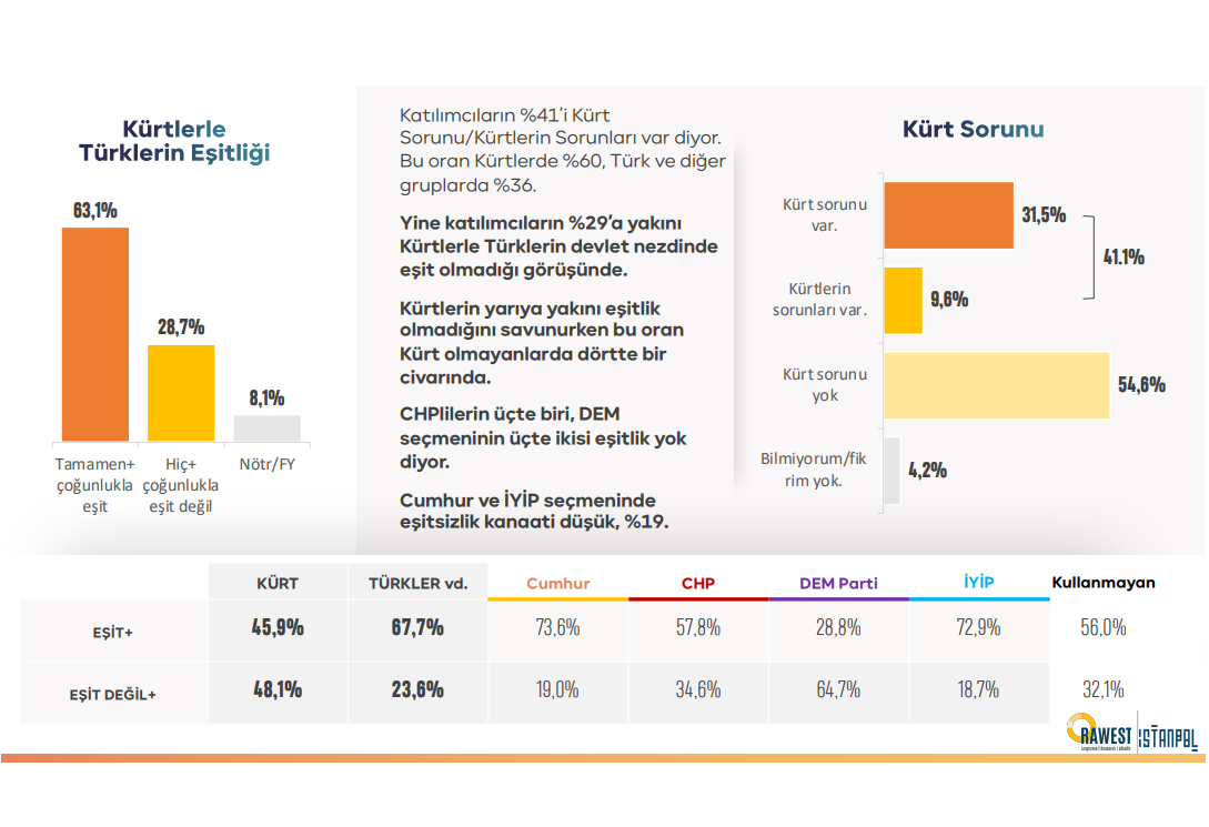 Rawest Araştırma ve IstanPol işbirliğiyle gerçekleştirilen “Kürt Meselesinde Yeni Dönem: Türkiye Toplumunun Algı, Kanaat ve Tutumları” başlıklı araştırma 23 Haziran 2025’te İstanbul’da sivil toplum, medya ve araştırma dünyasıyla paylaşıldı.