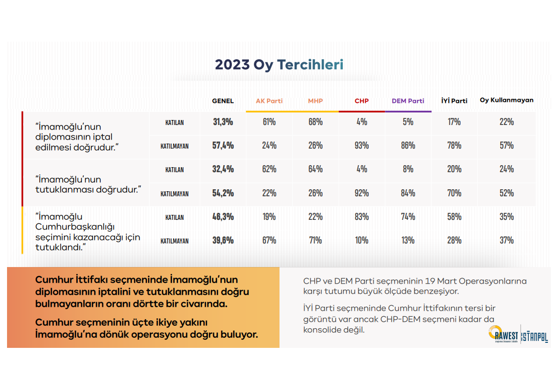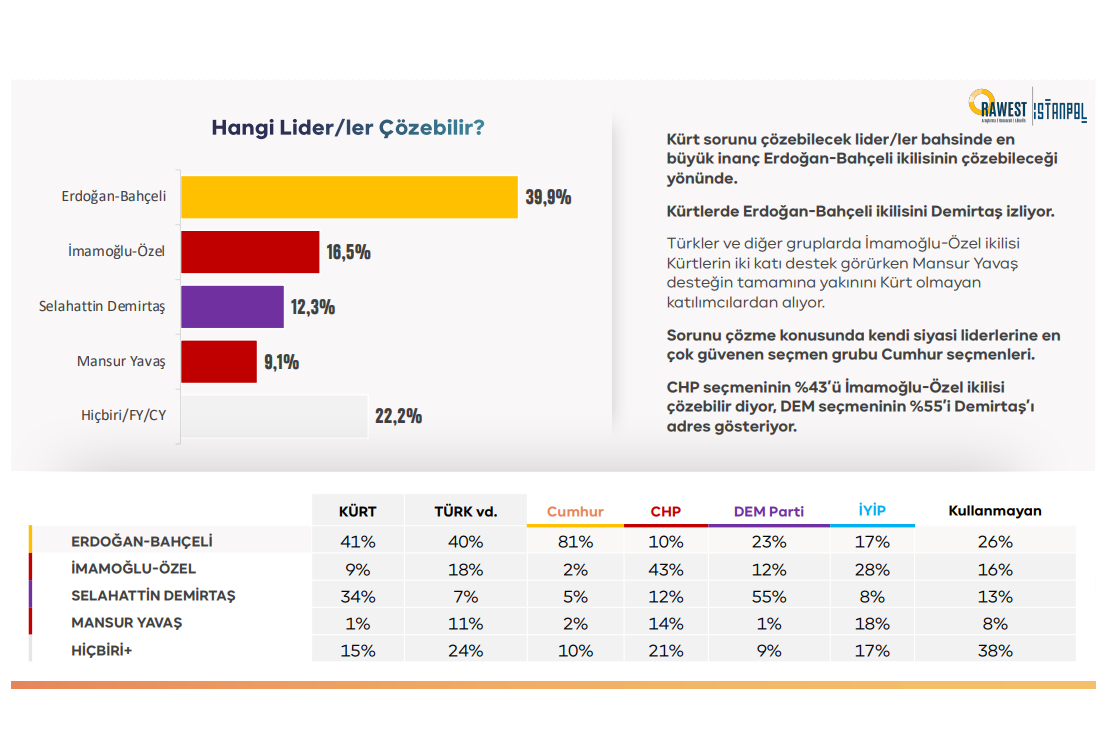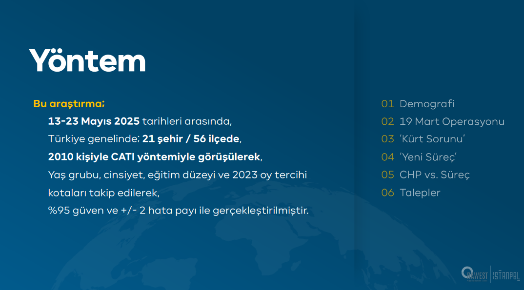 13-23 Mayıs 2025 tarihleri arasında Türkiye genelinde 2010 kişiyle yapılan araştırma, farklı yaş grupları, eğitim durumu ve etnik kimlikten katılımcıların Ekrem İmamoğlu’nun tutuklanması ve CHP’ye yönelik yargılamaları içeren 19 Mart süreci, Kürt meselesi; 1 Ekim’de Devlet Bahçeli’nin inisiyatifi ile başlayan ve PKK’nin fesih kararıyla devam eden yeni süreç hakkındaki görüşlerine ek olarak toplumsal taleplere de yer veriyor.