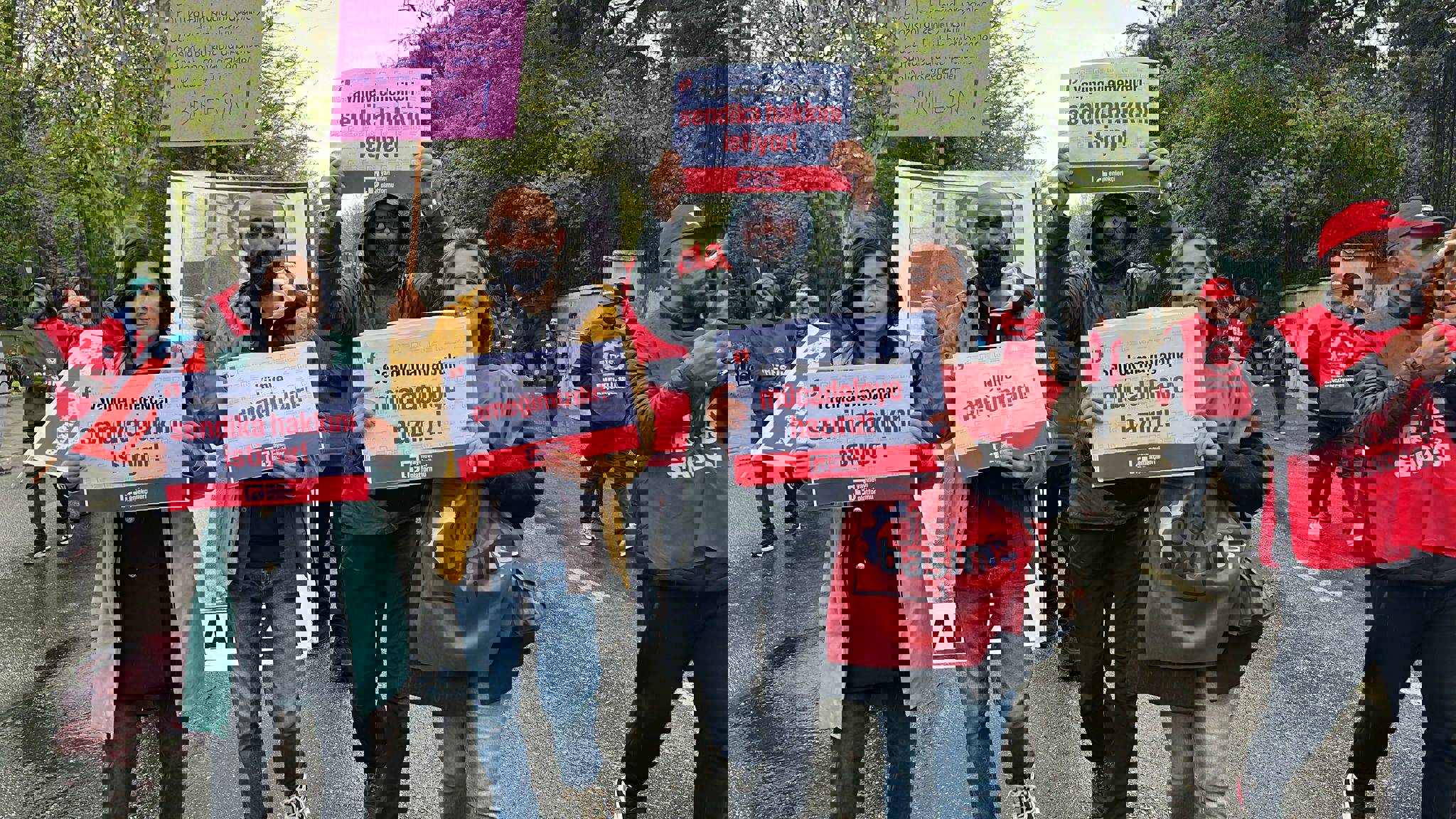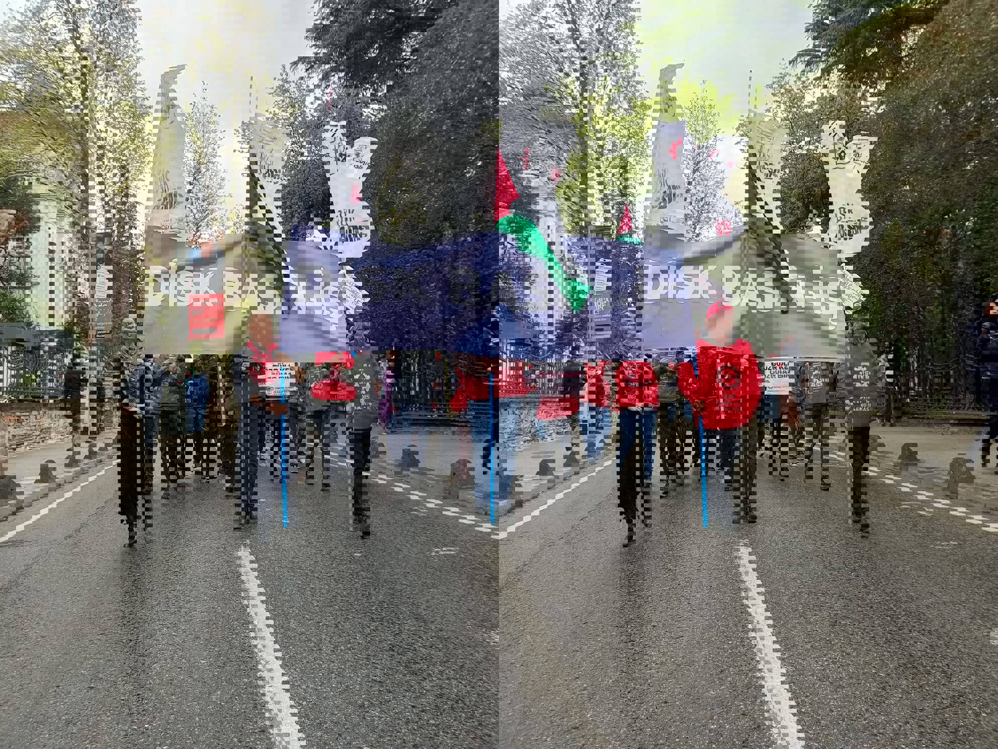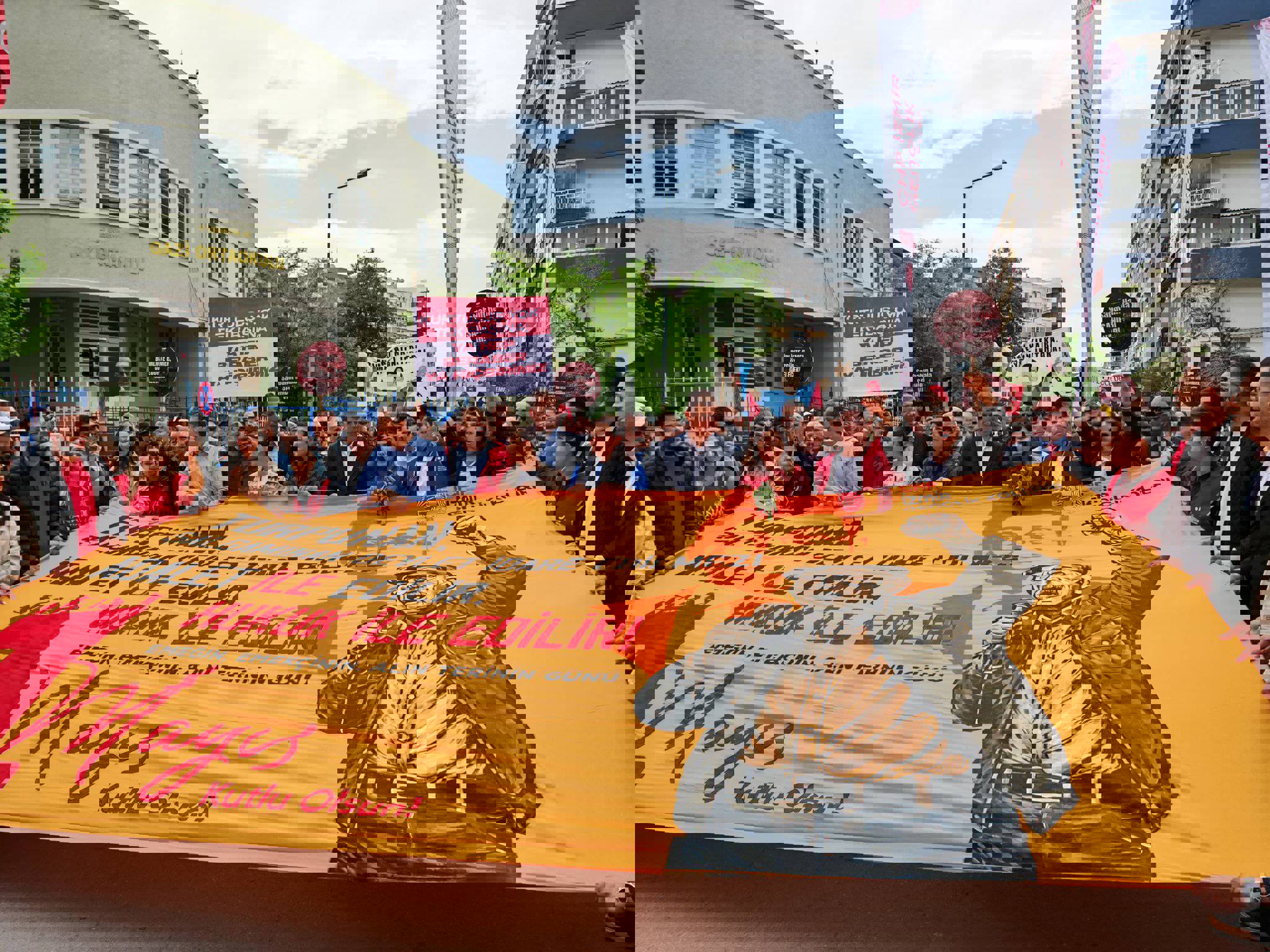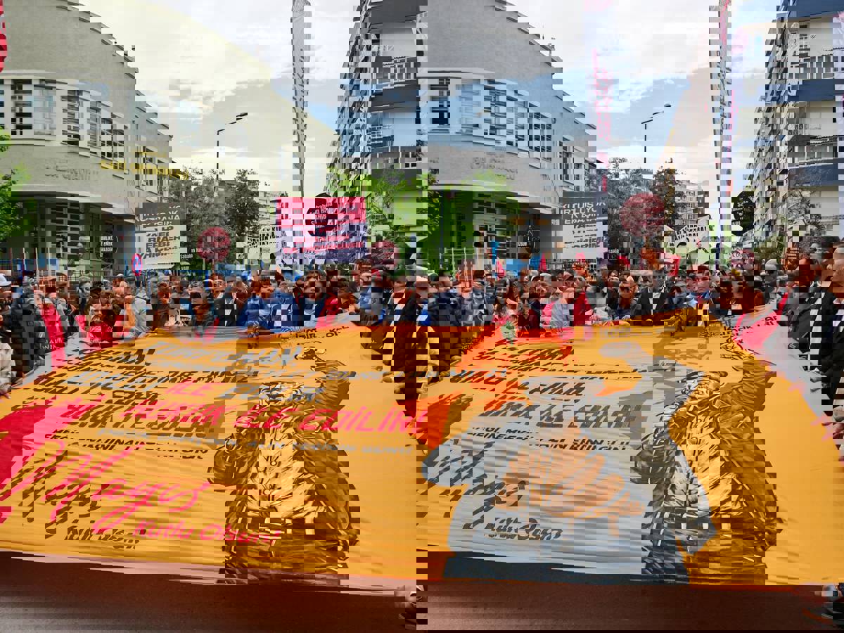 DİSK'in kurucu beş sendikasından biri olan DİSK Basın İş, Kadıköy'de düzenlenen 1 Mayıs'a, 1977 yılında sendikanın taşıdğı pankartın benzeri ile katıldı. Katılımcılar geçtiğimiz günlerde yaşamını yitiren Ceren İskit'in portresini ve Filistin bayrakları da taşıdılar.