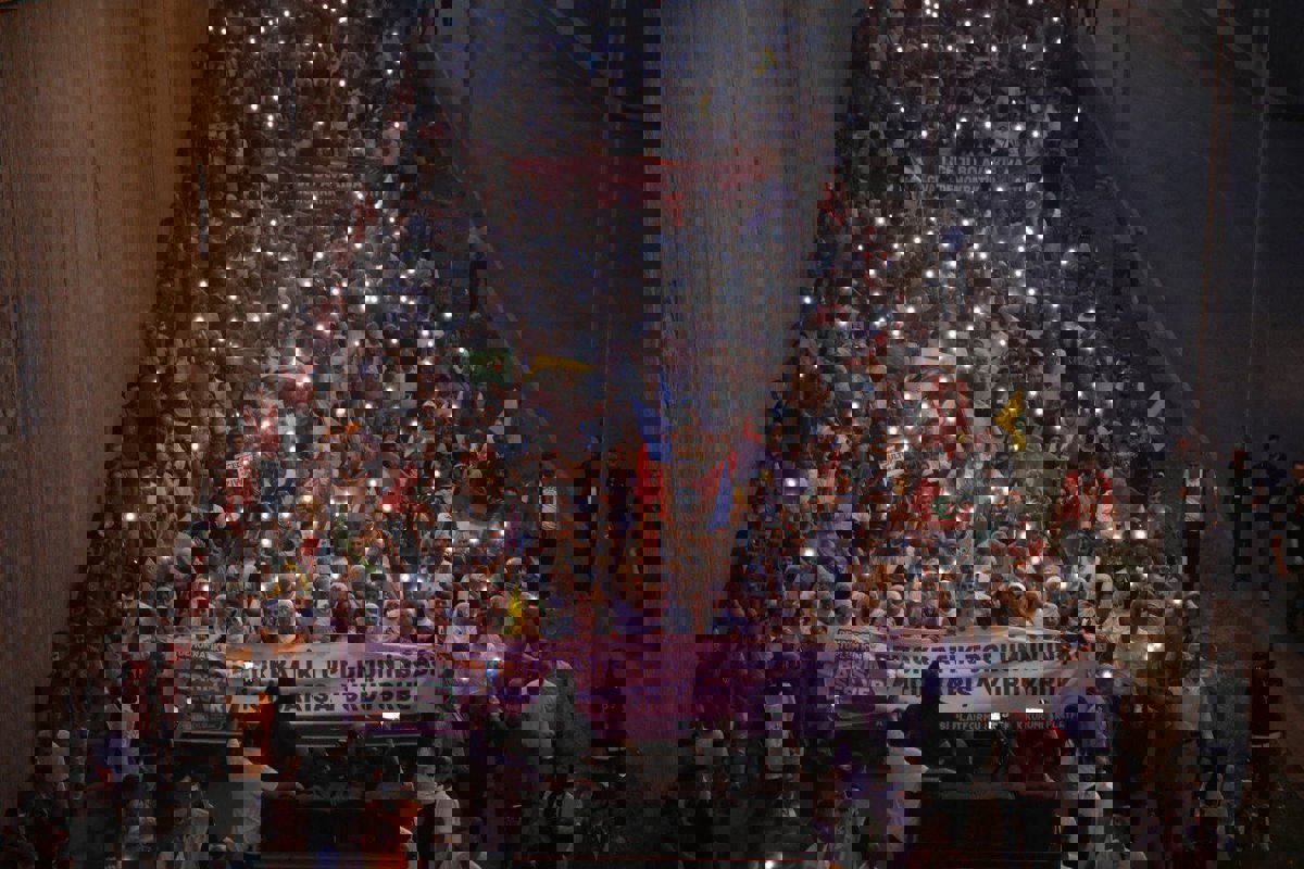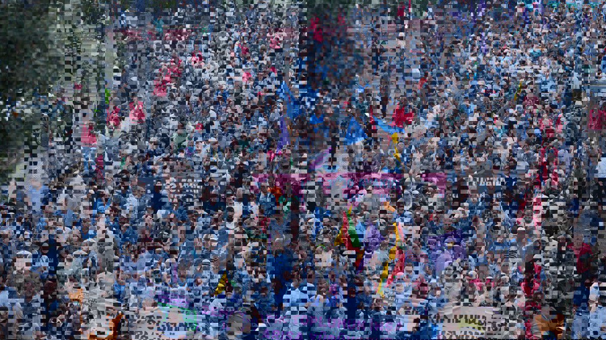 Bi deh hezaran kesên ku dirûşmeyên wan li kolanên Amedê olan dan, bi coşe mezin gihîştin ber AZC Plazayê. Li vir, girseyê sirûda Çarxa Şoreşê got û daxuyanî da. Hevserokê DEM Partiyê yê Amedê Abbas Şahîn li vir peyama Rêberê PKKê Abdullah Ocalan a ji bo 1ê Îlonê Roja Aştiyê ya Cîhanê xwend.