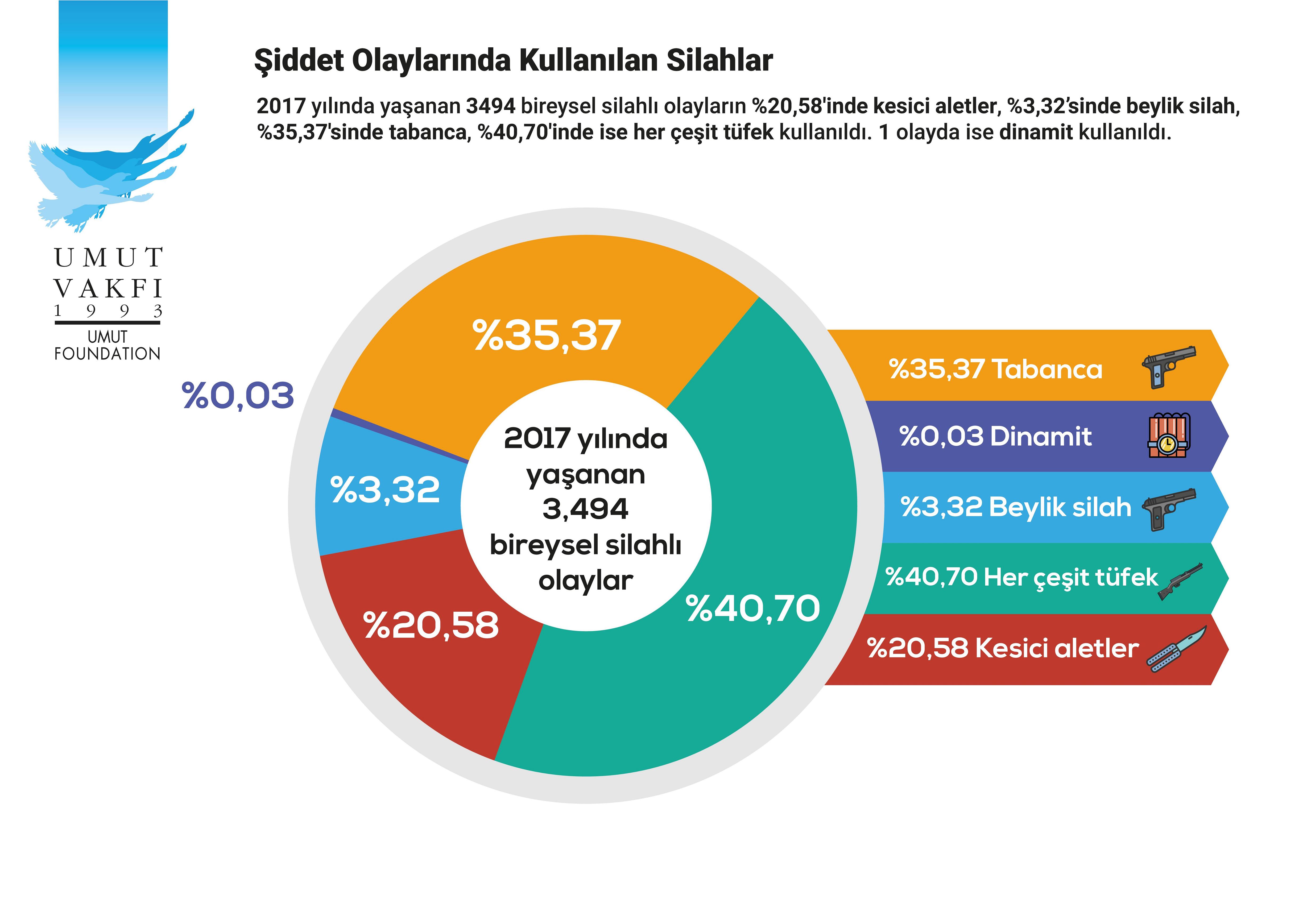 Silahlı şiddet olaylarının yüzde 80’inde ateşli silahlar: 1352 tabanca, 1422 tüfek. Yüzde 20,58’inde ise çoğunluğu bıçak olmak üzere kesici aletlerin kullanıldı.