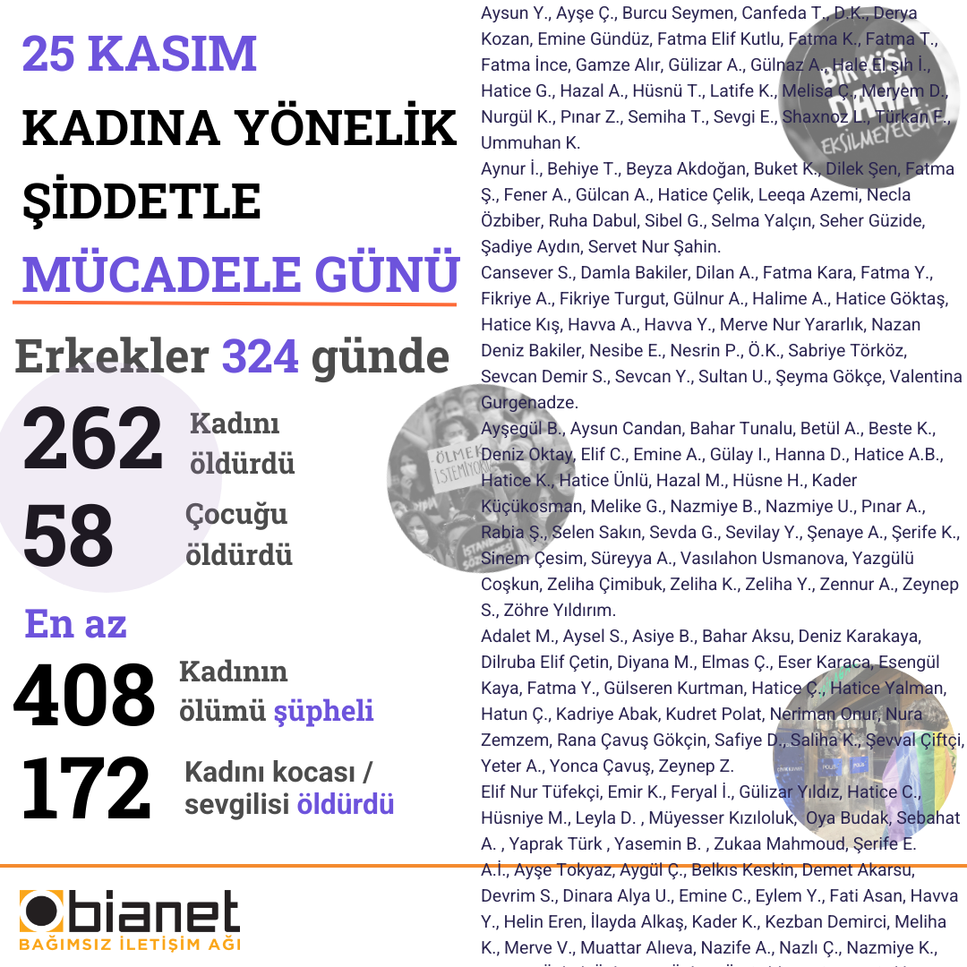 bianet'in yerel ve ulusal gazetelerden, haber sitelerinden ve ajanslardan derlediği haberlere göre; erkekler, Türkiye’nin birçok ilinde 1 Ocak 2025 – 21 Kasım 2025 dönemindeki 324 günde, en az 262 kadını öldürdü.