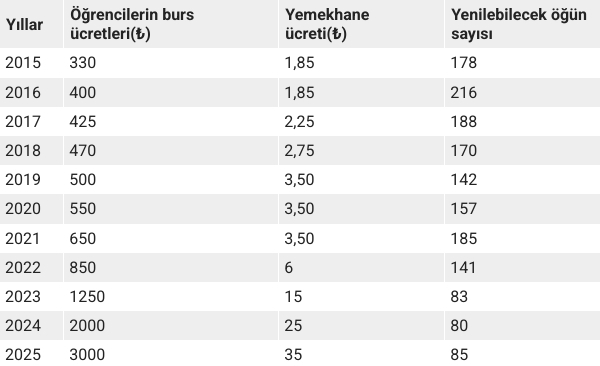 Güneş, 2021'de o yıl verilen burs ücretiyle İstanbul Üniversitesi'nin yemekhanelerinde 185 öğün yiyilebilirken bu sayının 2025'e gelindiğinde 85'e düştüğünü ekledi.