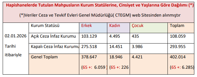 "2 Ocak 2026 tarihi itibariyle hapishanelerde toplam 402 bin 14 mahpusun olduğunu görüyoruz. Aralık verilerine göre 31 bin 529 gibi bir azalma görünüyor. Bu 11. Yargı Paketi kapsamında bazı adli suçlar bakımından infaz indirimiyle kişilerin serbest kalmasıyla ilgili ancak kalabalık sorunu ciddi bir sorun olarak hala devam ediyor.