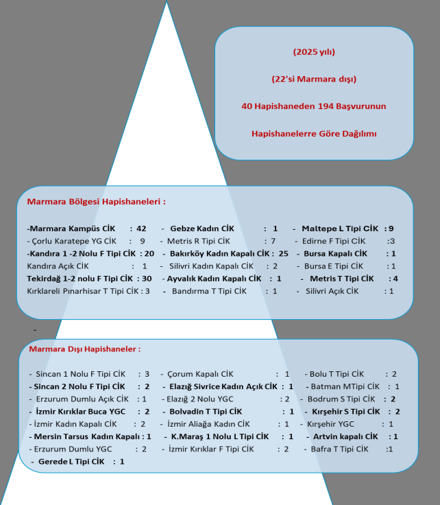 Ocak ayında 13, Şubat ayında 15, Mart ayında 8, Nisan ayında 15, Mayıs ayında 18, Haziran ayında 19, Temmuz ayında 18, Ağustos ayında 15, Eylül ayında 26, Ekim ayında 13, Kasım’da 18, Aralık ayında 16 başvuru yapıldı. Başvuruların 161’i Marmara bölgesi hapishanelerinden ve 33’ü Marmara dışı hapishanelerden toplam 194 başvuru bulunuyor. Bunların 34’ü kadın, 157’si erkek, 3’ü LGBTİ+ mahpuslar, 29’u adli, 165’i politik nedenlerle hapiste tutulan mahpuslar, 7’si ise göçmen mahpuslar tarafından gerçekleştirildi.