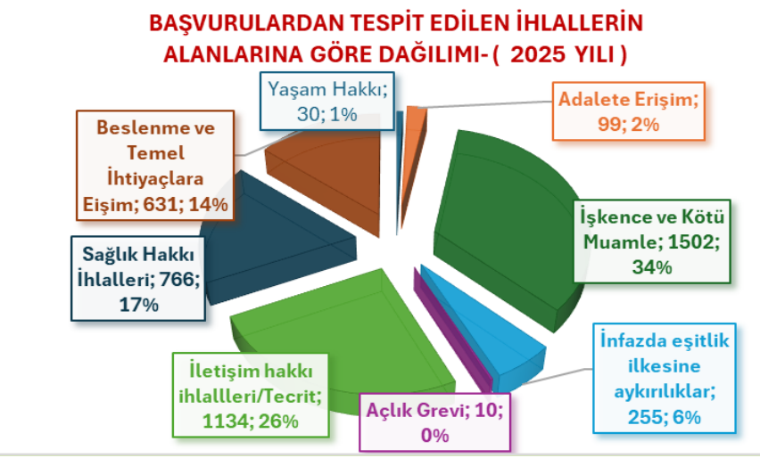 Raporda, tespit edilen ihlallerin yüzde 34'ünün işkence ve kötü muamele, yüzde 17'sinin iletişim hakkı ihlali/tecrit, sağlık hakkı, yüzde 14'ünün beslenme ve temel ihtiyaçlara erişim, yüzde 6'sının infazda eşitlik ilkesine aykırılık, yüzde 2'sinin adalete erişim, yüzde 1'nin yaşam hakkı ihlali alanında yaşandığı kaydedildi.