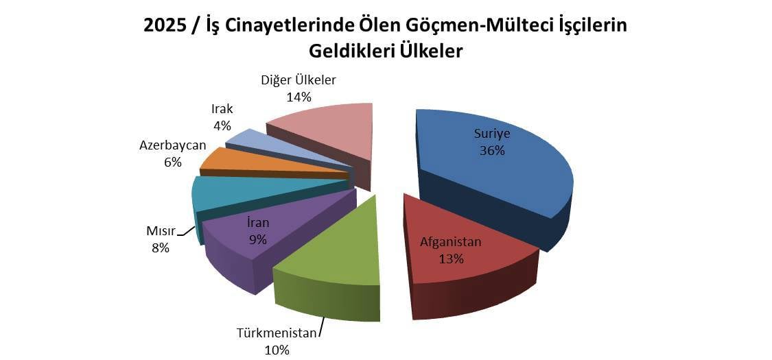 Göçmen/mülteci işçiler açısından da tablo ağır: 2025’te 91 göçmen/mülteci işçi yaşamını yitirdi. Raporda Suriyeli ve Afganistanlı işçiler toplamın yaklaşık yarısını oluşturdu.