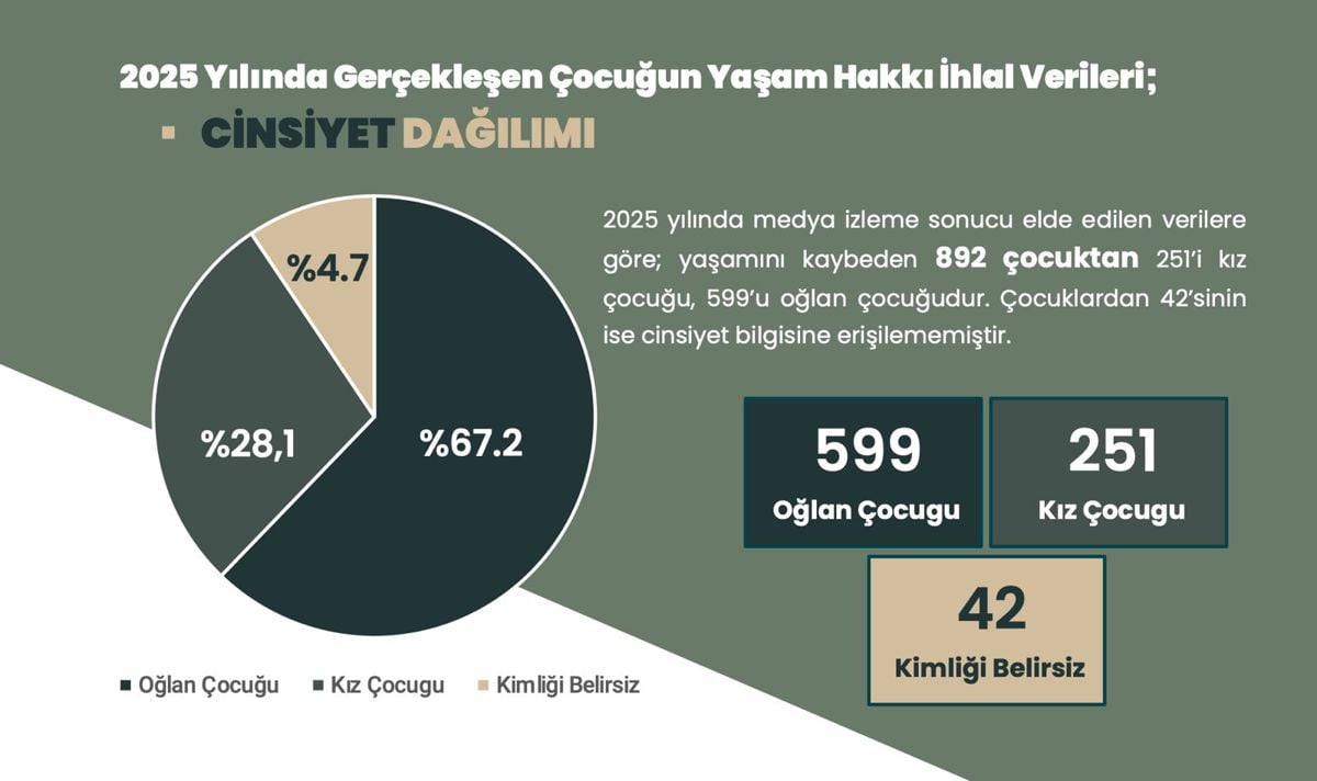 İl dağılımına göre en yüksek sayıda çocuk ölümü Urfa’da kaydedildi. Bu ili İstanbul, Bolu, Antep ve Konya izledi. Rapora göre 2025’te yaşamını yitiren 892 çocuğun 599’u oğlan çocuğu, 251’i kız çocuğu; 42’sinin ise cinsiyet bilgisine ulaşılamadı.