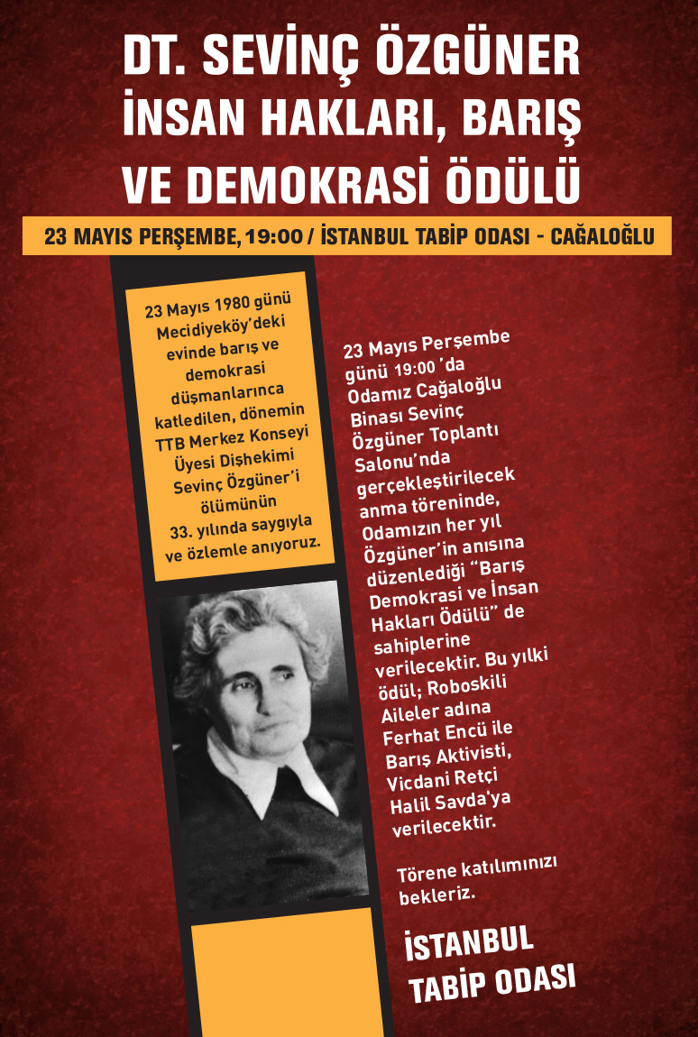 19:00 İstanbul Tabip Odası "Anma Programı ve Dt. Sevinç Özgüner İnsan Hakları, Barış ve Demokrasi Ödülü Töreni" Türkocağı Cad. No:19 K:4 Cağaloğlu/İstanbul (İletişim: 212 514 02 92)