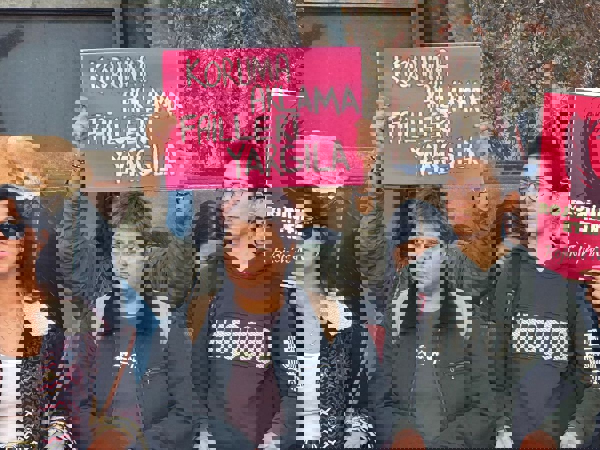 Hayatlarımızı daraltmaya çalışan, kadın cinayetlerini engellemek yerine kazanımlarımızı hedef alan bu erkek egemen sisteme ve erkek devletin politikalarına karşı öfkemizle, dayanışmamızla, mücadelemizle buradayız.