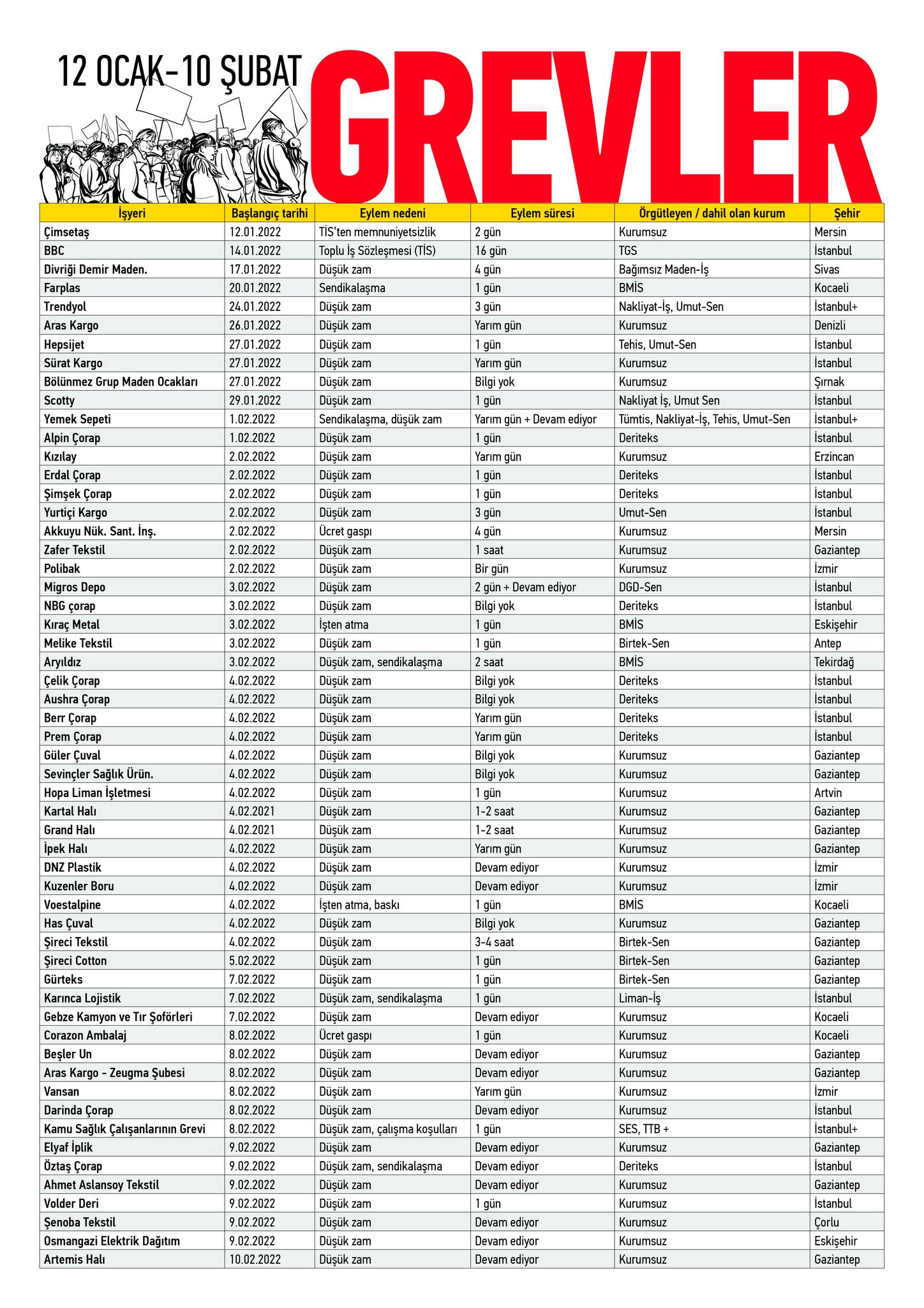 Emek Çalışmaları Topluluğu'nun (EÇT) 2022'nin ilk 40 gününde gerçekleşen grevlerin dökümünü yayınladı. 65 grevin 44'ü İstanbul ve Gaziantep'te, diğerleri İzmir, Kocaeli, Mersin, Eskişehir ve Tekirdağ'da. En çok grev tekstil, taşımacılık ve petrokimya sektörlerinde.