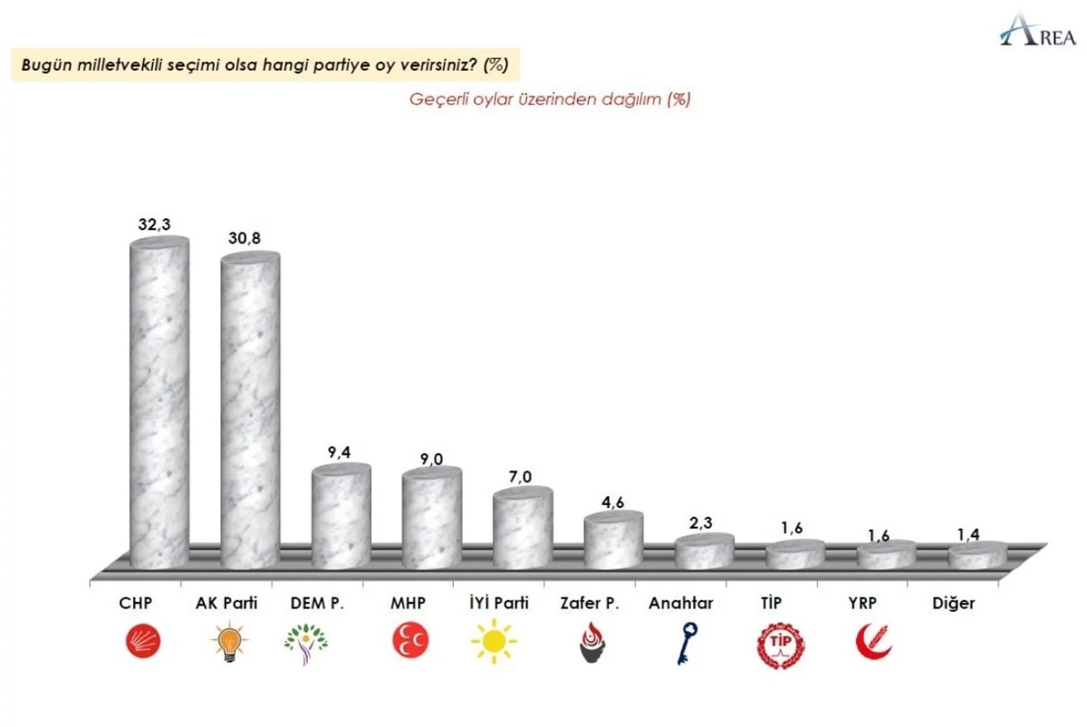 AREA Araştırma'nın 24-30 Eylül arasında 26 ilde gerçekleştirdiği anket sonuçlarına göre, "bugün milletvekili seçimi olsa hangi partiye oy verirsiniz" sorusunu yanıtlayan seçmenlerin çoğunluğu tercihini CHP olarak belirledi. AKP ikinci, DEM üçüncü, MHP dördüncü parti olarak belirledi.
