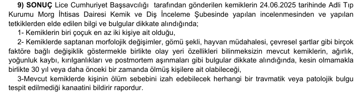 ATK raporunda, kemiklerde saptanan morfolojik değişimlerin; gömü şekli, hayvan müdahalesi ve çevresel koşullar gibi birçok etkene bağlı olarak değişebileceği belirtilirken, yaklaşık 30 yıl veya daha önce ölmüş kişilere ait olabileceği vurgulandı. Raporda ayrıca, kemiklerde ölüm nedenini açıklayabilecek herhangi bir travmatik ya da patolojik bulguya rastlanmadığı belirtildi.
