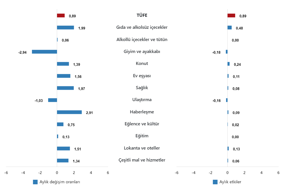 İlgili ana grupların aylık değişime olan etkileri ise gıda ve alkolsüz içeceklerde yüzde 0,48, ulaştırmada yüzde -0,16 ve konutta yüzde 0,24 oldu.