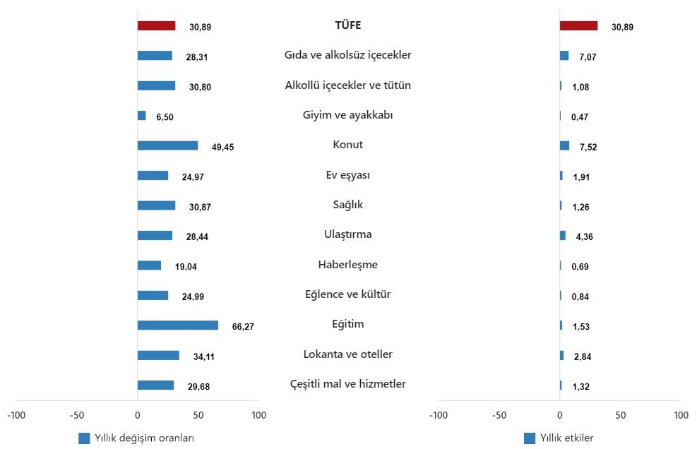 En yüksek ağırlığa sahip 3 ana harcama grubunun yıllık değişimleri; gıda ve alkolsüz içeceklerde yüzde 28,31 artış, ulaştırmada yüzde 28,44 artış ve konutta yüzde 49,45 artış olarak gerçekleşti.