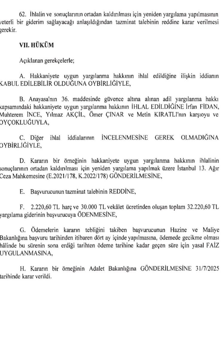 Anayasa Mahkemesi, tüm bu gerekçelerle Anayasa’nın 36. maddesiyle güvence altına alınan adil yargılanma hakkının ihlal edildiğine hükmetti. Karara beş üye karşı oy kullandı.