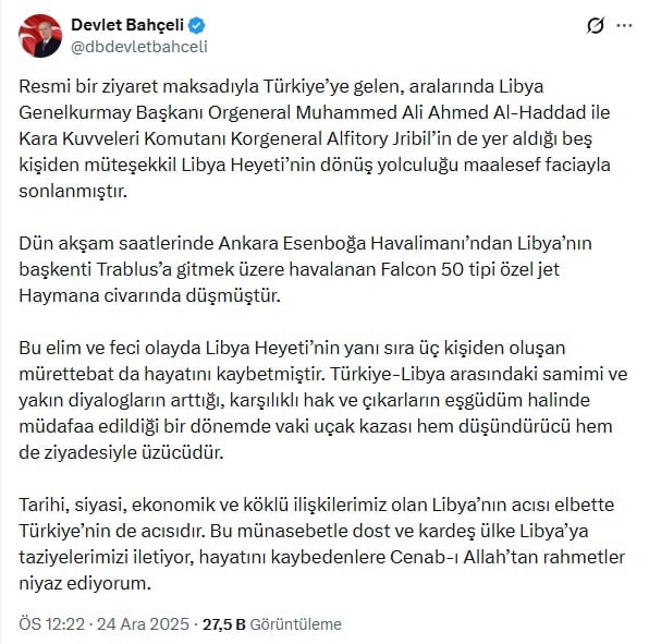 Bahçeli, X sosyal medya hesabından paylaştığı mesajda, Libya Genelkurmay Başkanı Orgeneral Muhammed Ali Ahmed Al-Haddad ile Kara Kuvveleri Komutanı Korgeneral Alfitory Jribil’in de yer aldığı beş kişilik Libya heyetinin yanı sıra üç kişilik mürettebatın da hayatını kaybettiğini hatırlattı.
