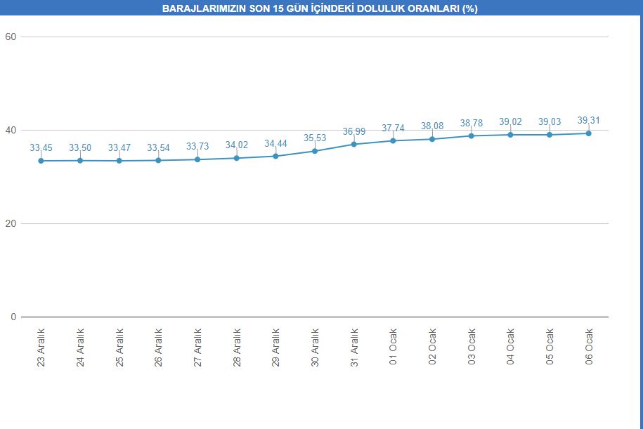 21 Aralık'ta yüzde 33.98 doluluk oranı ölçülen barajlardaki doluluk bugün ise yüzde 39,31 olarak ölçüldü.
