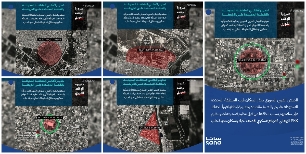 Suriye Savunma Bakanlığı, Şeyh Maksud Mahallesi’nde “SDG milislerine ait mevziler” bulunduğu iddiasıyla bazı yerleşim alanlarının konumlarını paylaştı; sivillerden “güvenlikleri için” bu alanları tahliye etmelerini istedi.