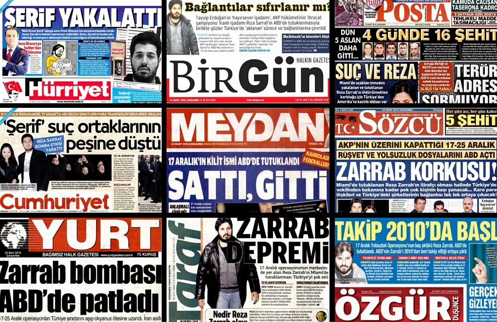 Rıza Sarraf’ın bankacılık sahtekârlığı, İran’a yaptırımları ihlal etmek, karapara aklamak ve ABD’yi dolandırmak suçlamaları nedeniyle tutuklanması ve hakkında 75 yıl hapis istenmesi 27 gazetenin 11’inde ilk sayfada hiç yer bulamadı.