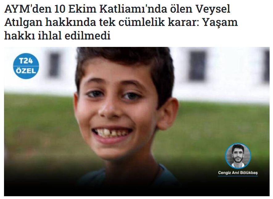 Yazılı Haber Ödülü’nü kazanan diğer isim ise T24’te “AYM'den 10 Ekim Katliamı'nda ölen Veysel Atılgan hakkında tek cümlelik karar: Yaşam hakkı ihlal edilmedi” başlığıyla yayımlanan haberiyle Cengiz Anıl Bölükbaş oldu. “Fikri takip” ile yapılan haber, 10 Ekim 2015'te meydana gelen Gar Katliamı ile adalet arasındaki çarpıklığı 9 yaşında yaşamını yitiren Veysel Atılgan üzerinden anlatıyor.
