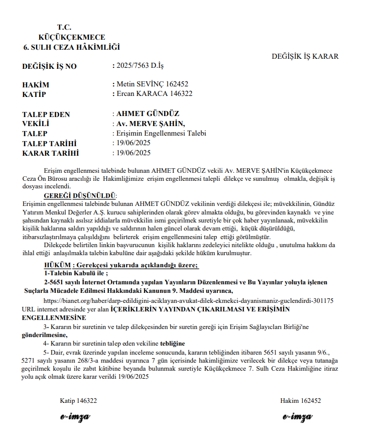 “Küçükçekmece 6. Sulh Ceza Hâkimliği” imzasıyla düzenlenmiş gibi görünen PDF dosyası, MHP’li Ahmet Gündüz adına erişim engeli talebinde bulunuluyor.