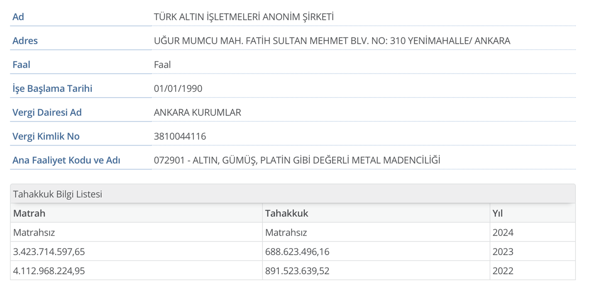 2025 yılı faaliyet raporunda belirtildiği haliyle şirket 2024 yılında 100 bin ons altın çıkarmış olmasına karşılık, vergi kayıtlarına bakıldığında yılı matrahsız olarak tamamladığı ve bu nedenle de kurumlar vergisi ödemediği görülüyor.