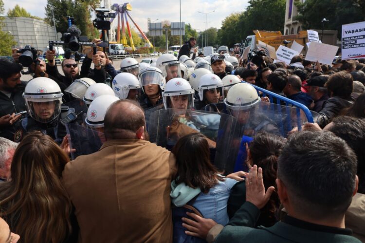 #10Ekim10yıl | 10 Ekim Katliamı'nda yaşamını yitirenleri anmak üzere Ankara Garı'ndan Ankara Adliyesi'ne yürümek isteyenlerin önüne polis barikat kurdu, biber gazıyla müdahale etti.