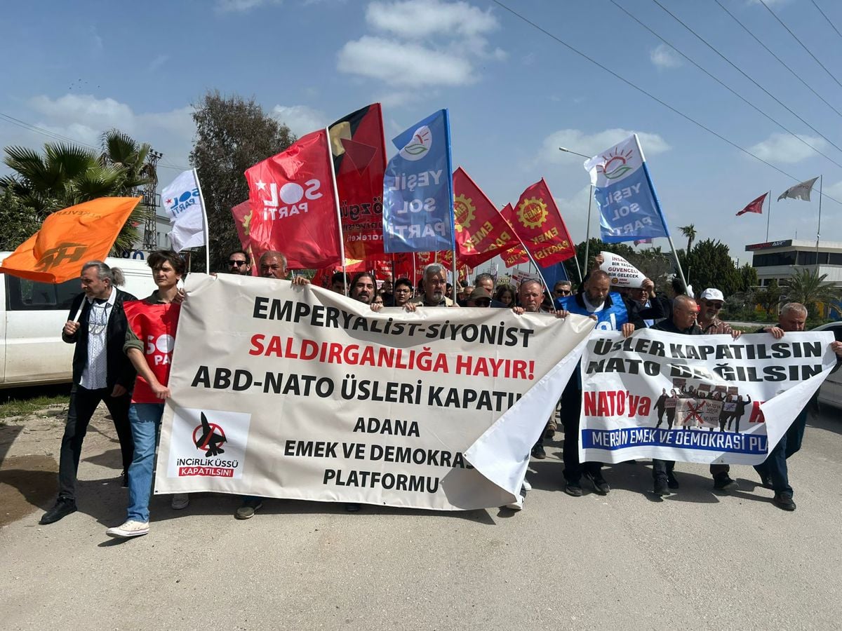 Adana’daki eylemin adresi İncirlik Üssü oldu. Adana ve Mersin Emek ve Demokrasi Platformları’nın çağrısıyla düzenlenen eyleme EHP, EMEP, Halkevleri, Kaldıraç, Kızıl Parti, Sol Parti, TİP, TÖP, Yeşil Sol Parti’nin yanı sıra TÖP Sözcüsü ve DEM Parti Mersin Milletvekili Perihan Koca ile EMEP İstanbul Milletvekili İskender Bayhan da katıldı.