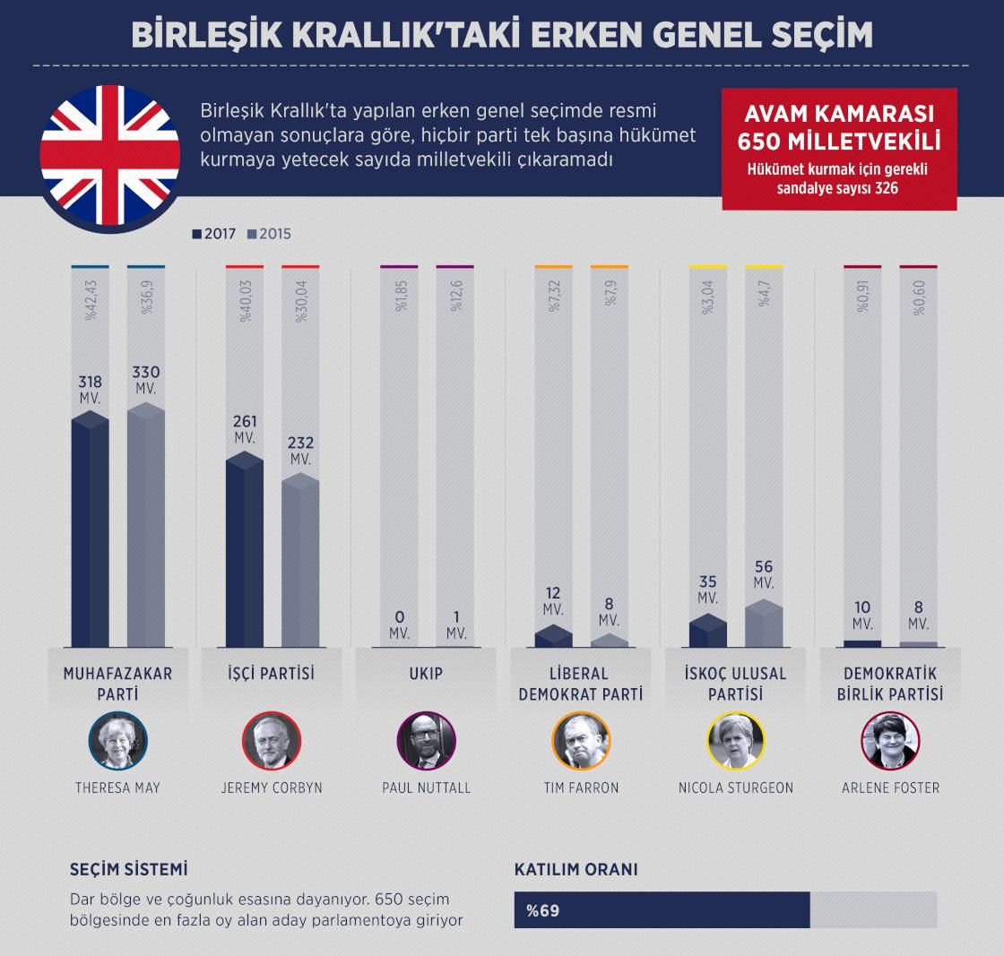 Kesin sonuçlara göre, parlamentoda Theresa May liderliğindeki Muhafazakar Parti 318, Jeremy Corbyn liderliğindeki İşçi Partisi 262, Nicola Sturgeon liderliğindeki İskoç Ulusal Partisi (SNP) 35, Tim Farron liderliğindeki Liberal Demokrat Parti 12, Arlene Foster liderliğindeki Kuzey İrlanda Demokratik Birlik Partisi (DUP) 10 ve diğer partiler ise 13 sandalye kazandı.