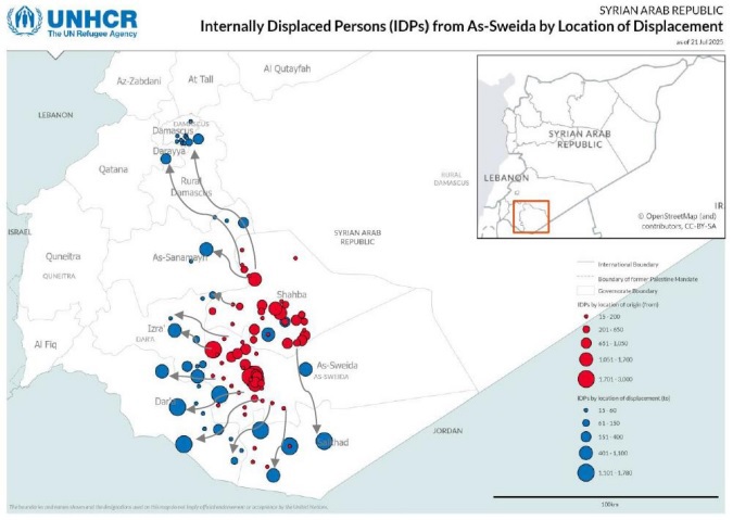 İnsanların güvenliğe ya da daha iyi yaşam koşullarına ulaşma umuduyla sık sık yer değiştirmeye devam ettiğini belirten UNHCR, 20 Temmuz itibarıyla Süveyda vilayeti içinde 51 bin 300, Süveyda’dan Dera’ya 40 bin 350, Şam kırsalına ise 950 olmak üzere toplam en az 92 bin 600 kişinin yerinden edildiğini bildirdi.