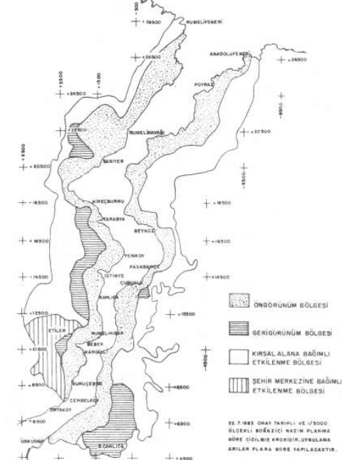 Boğaziçi Kanunu'na göre öngörünüm, gerigörünüm ve etkilenme bölgeleri. |