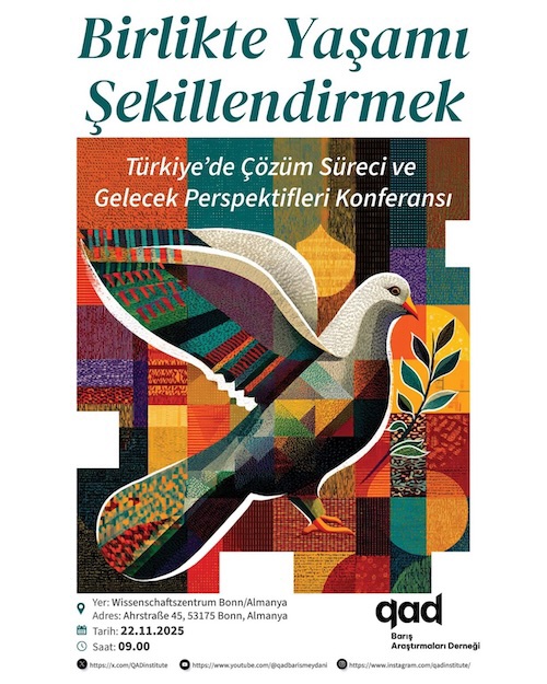 Almanya’da kurulu Barış Araştırmaları Derneği (QAD) 22 Kasım Cumartesi günü Bonn’da “Birlikte Yaşamı Şekillendirmek: Türkiye’de Çözüm Süreci ve Gelecek Perspektifleri” başlıklı bir konferans düzenliyor.