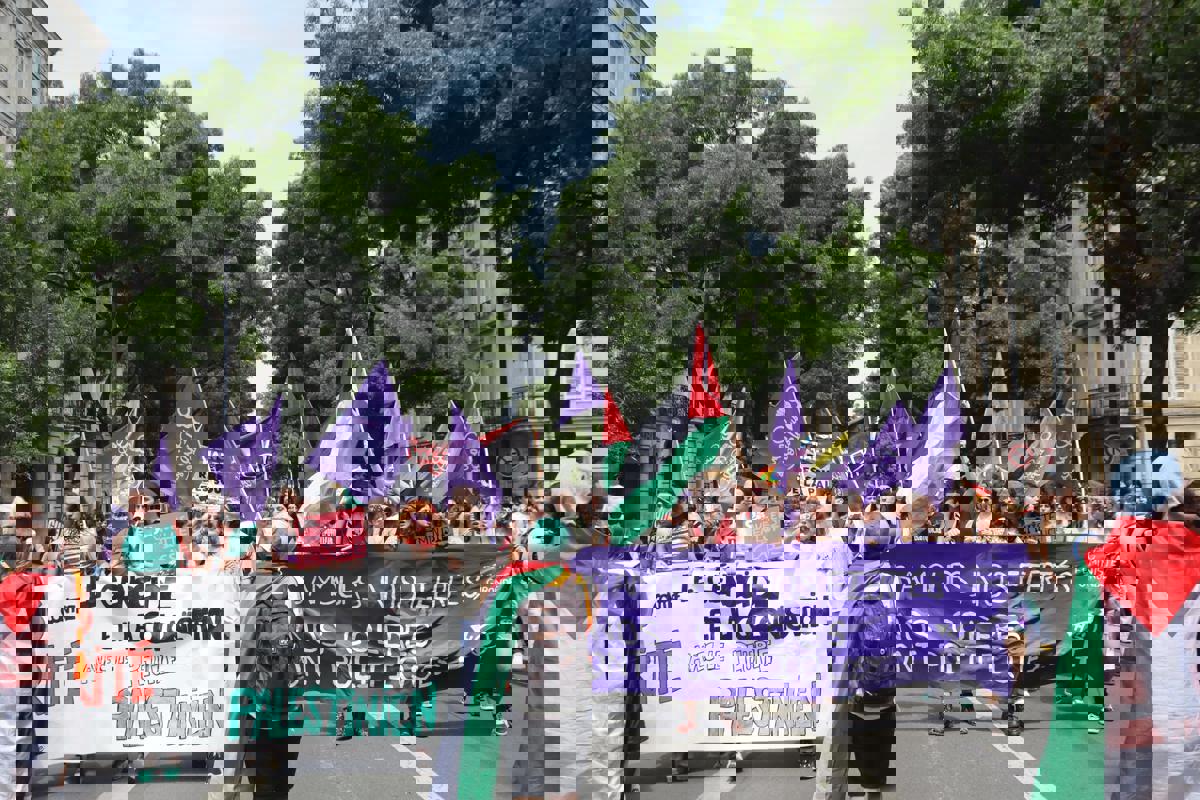 Yürüyüşün geneline damga vuran ise Filistin’le dayanışmaydı. Kalabalığın hemen her yerinde Filistin bayrakları, Filistin’le dayanışmak için yapılan dövizler ve pankartlar yer aldı. Pek çok kurum, “soykırımda ‘onur’ yok” sloganıyla yürüdü.