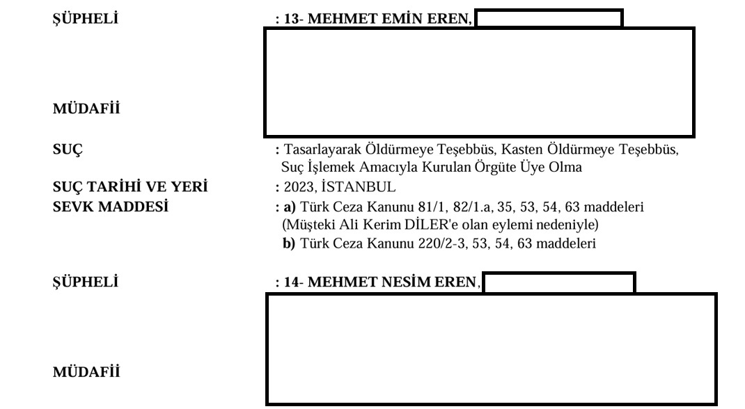 Yargılaması süren Mehmet Emin Eren’e yöneltilen suçlar arasında ise “Tasarlayarak Öldürmeye Teşebbüs, Kasten Öldürmeye Teşebbüs, Suç İşlemek Amacıyla Kurulan Örgüte Üye Olma” yer alıyor.