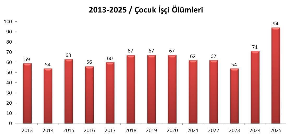 İşçi Sağlığı ve İş Güvenliği Meclisi (İSİG), 2025 yılına ilişkin çocuk iş cinayetleri raporunu yayımladı. Rapora göre, yıl boyunca en az 94 çocuk işçi çalışırken hayatını kaybetti. Ölen çocukların 26’sı 14 yaş ve altında, 68’i ise 15–17 yaş aralığında. Hayatını kaybedenlerin 13’ü kız, 81’i oğlandı. Beş çocuk ise göçmendi.