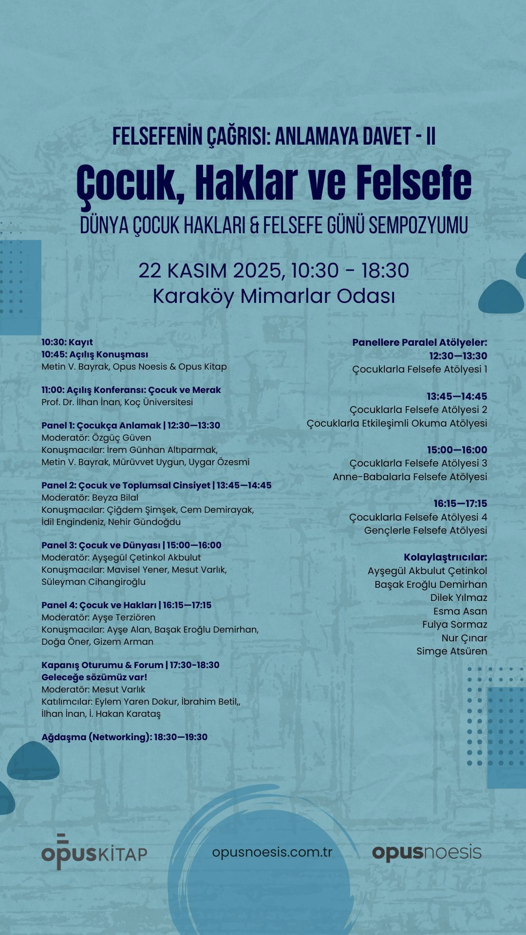 Opus Noesis & Opus Kitap tarafından düzenlenen “Felsefenin Çağrısı: Anlamaya Davet II” sempozyumu, bu yıl çocuk, merak ve hak kavramlarını merkeze alıyor. Etkinlik, 22 Kasım Cumartesi günü Karaköy Mimarlar Odası'nda yapılacak.
