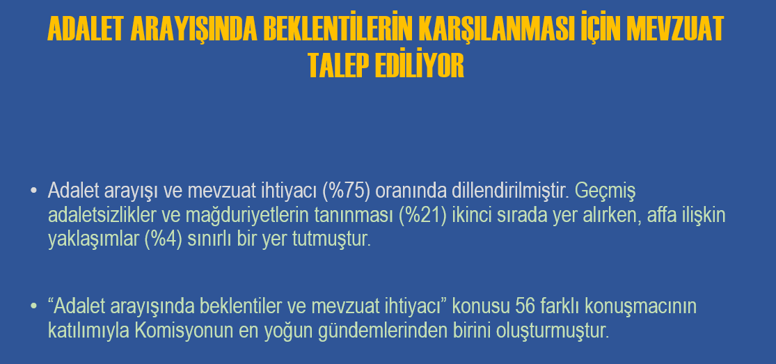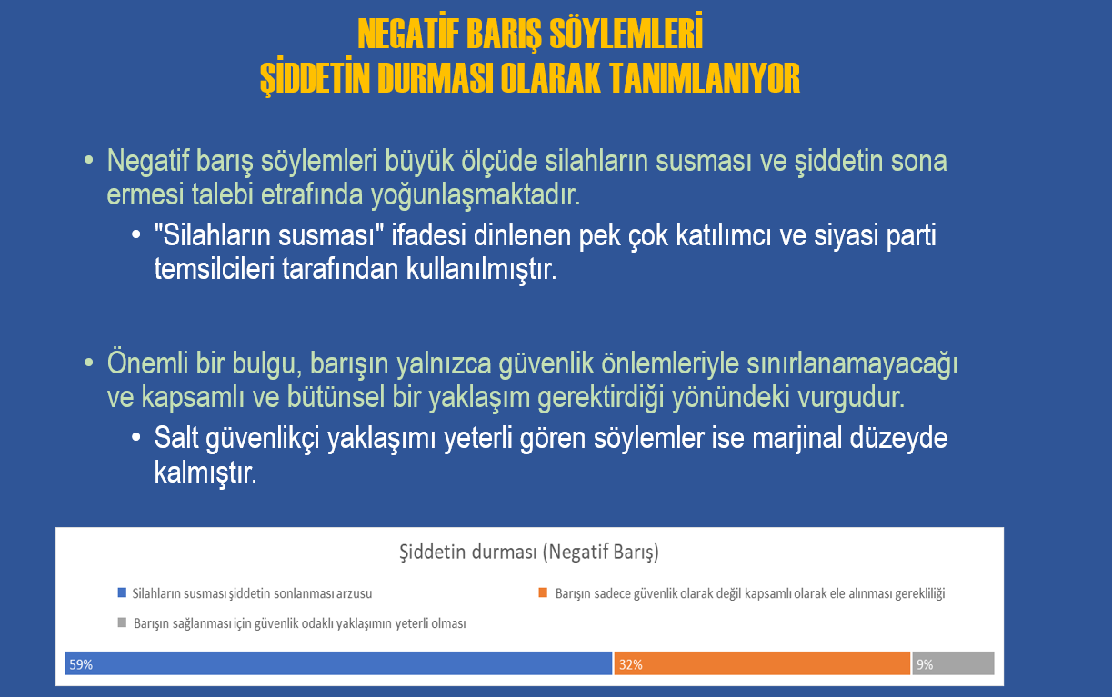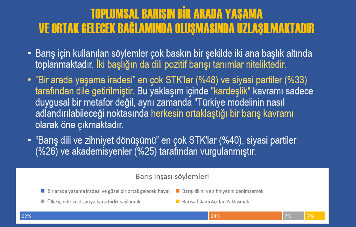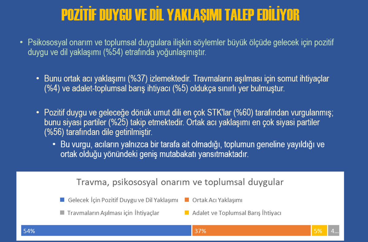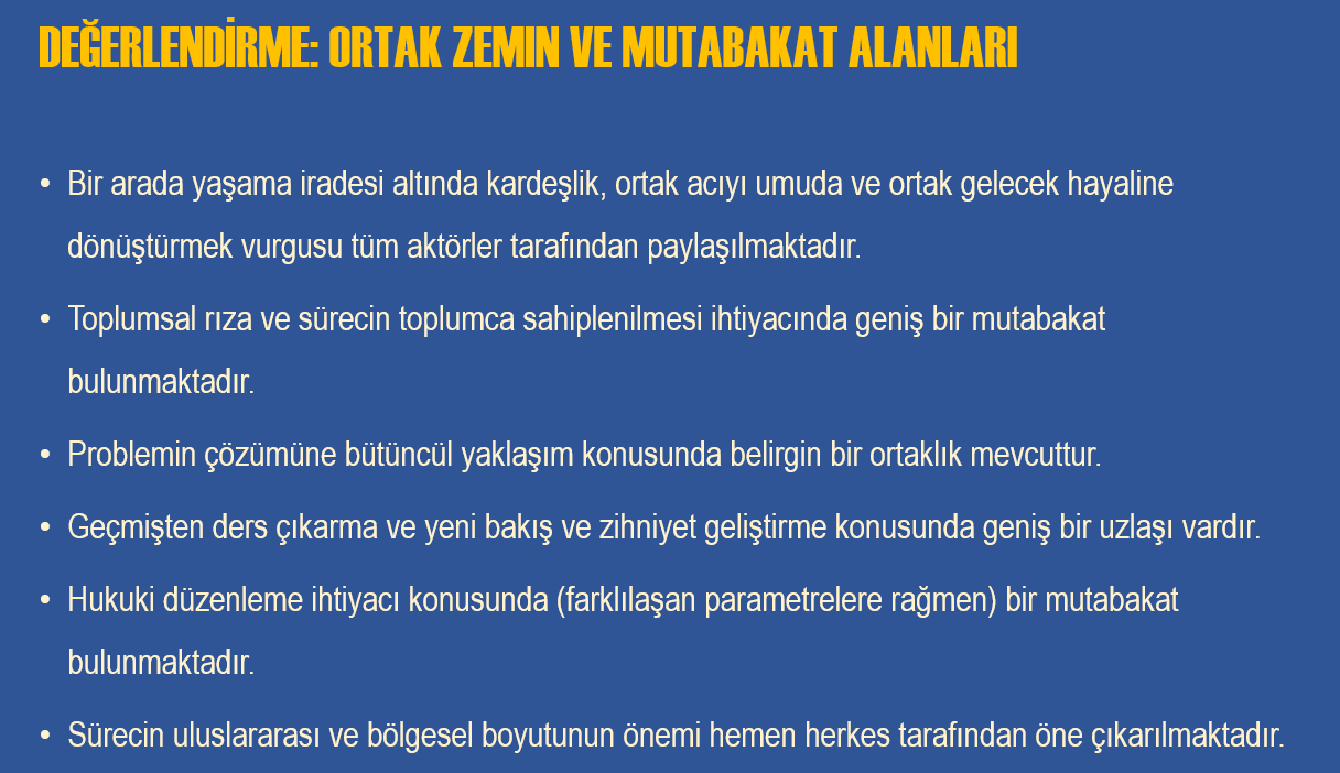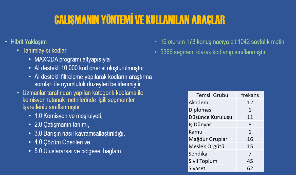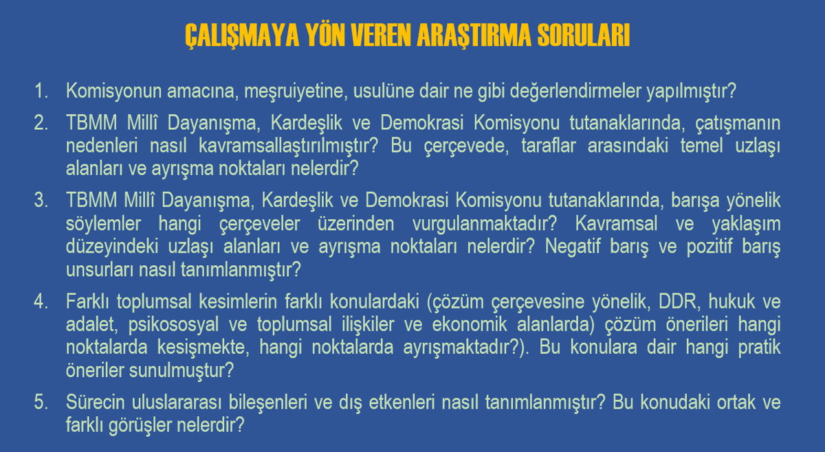 Komisyon tutanaklarında yer alan söylemleri, çatışmanın tanımı, barışın nasıl kavramsallaştırıldığı, çözüm önerilerinin hangi ortaklık ve ayrışma noktalarında şekillendiği üzerinden sistematik, kapsamlı ve karşılaştırmalı bir değerlendirme yapıldığını bildirildi.