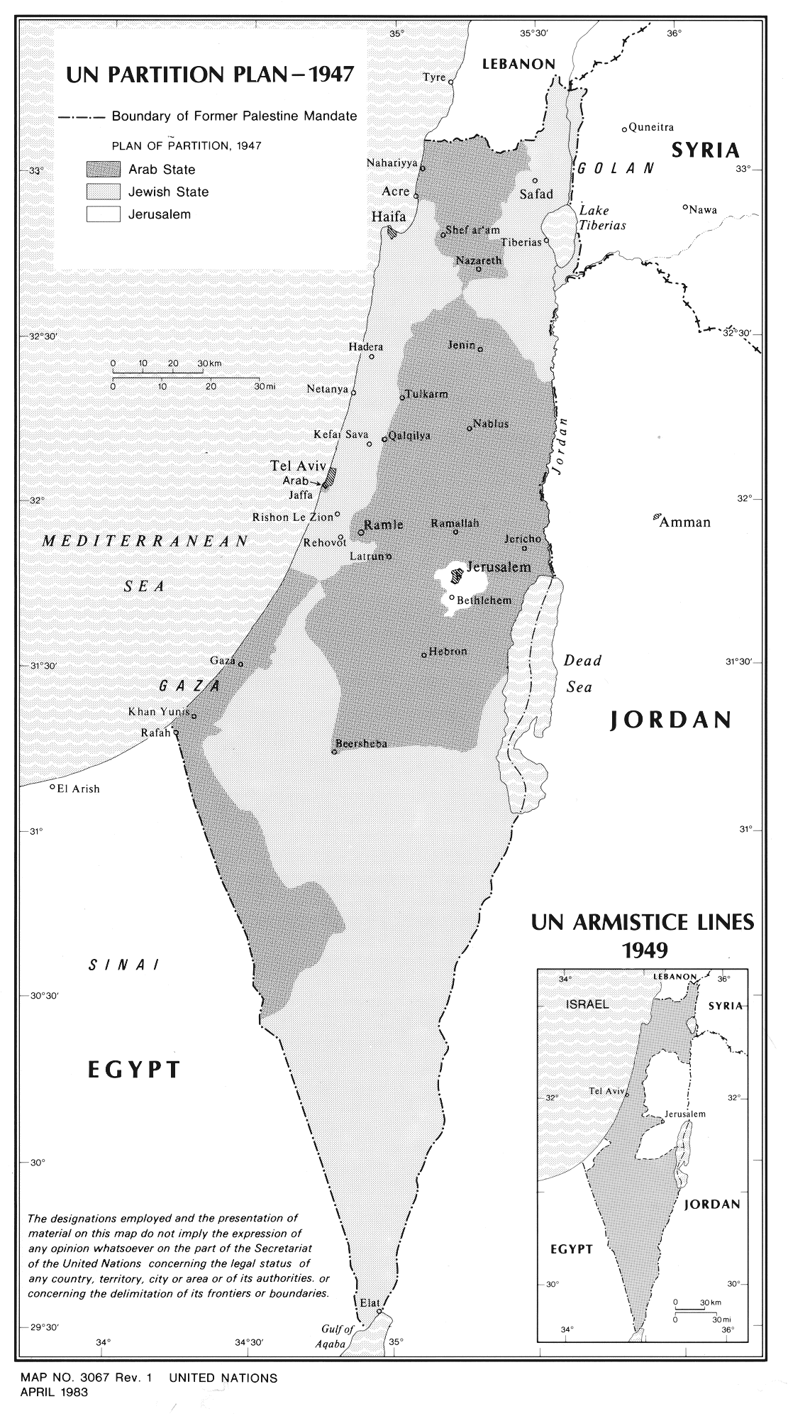 Statuya Qudûsê jî wek “bajarê navnetewî” hat diyarkirin. Ereban dixwestin serdestiya Brîtanyayê bi dawî bikin û serxwebûna xwe îlan bikin lê bi hatin û belawbûna nifûsa cihûyan nekarîn vê armancê pêk bînin. Di dawiyê de cihûyan di 1948ê de dewleta xwe bi navê Îsraîl bi fermî îlankirin. Şerê yekemîn di navbera ereban û Îsraîliyan de di heman salê dest pê kir û di nav salekê de bi “serkeftina” Îsraîlê bi dawî bû. Di encamê de nêzikî 750,000 Filistînî yekemcar ji cih û warê xwe bûn û herêm ji nû ve wek sê parçe hat dîzaynkirin: Dewleta Îsraîlê, Şerîaya Rojava û Xeze. Ji vê rojê ve, Dewleta Îsrîlê, bi awayekî sîstematîk hewil dide tevahiya Filistîniyan ji cih û warên wan derxîne.