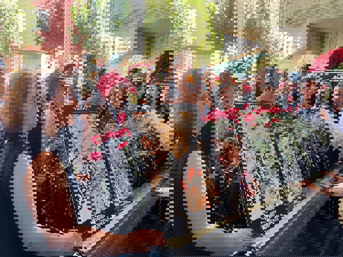 Çocukları, yakınları, sevenleri, mücadele arkadaşları; siyah örtüye sarılı tabutunu kırmızı karanfillerle donattılar, kendisiyle simgeleşen takılarını takıp “Buradayız Anne” sloganlarıyla ona veda ettiler.