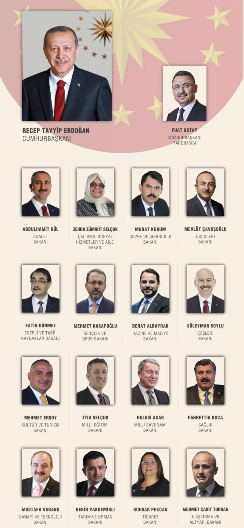 Cumhurbaşkanı Recep Tayyip Erdoğan’ın Meclis’te yemin edip Cumhurbaşkanlığı mazbatasını almasıyla birlikte ‘Cumhurbaşkanlığı Hükümet Sistemi’ndeki ilk kabinesini açıkladı.