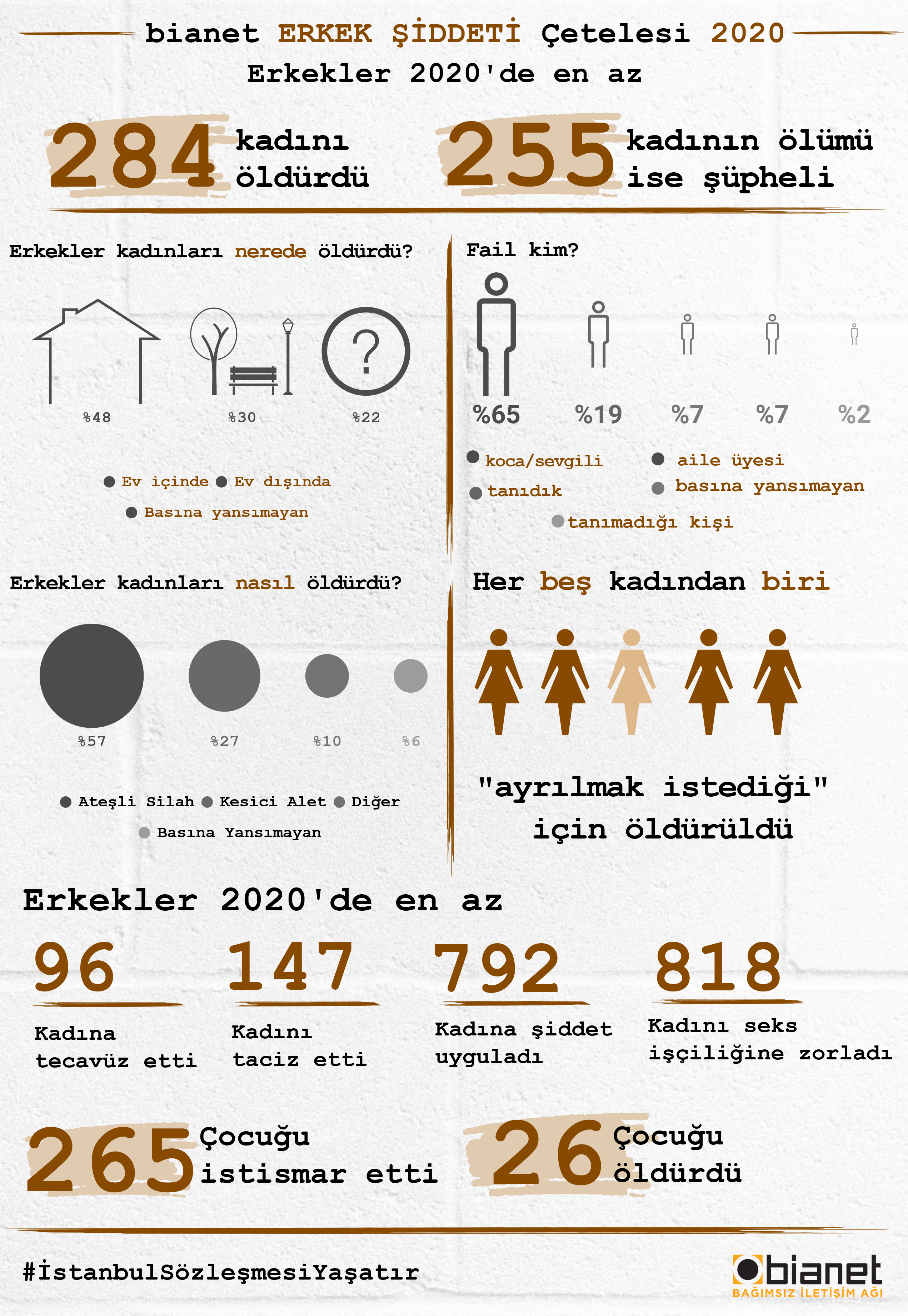 bianet'in 1 Ocak 2020 - 31 Aralık 2020 döneminde Türkiye'deki yerel, ulusal ve internet basınına yansıyan haberlerden derlendiği güncel verilere göre, erkekler, 2020'da en az 284 kadını öldürdü.
