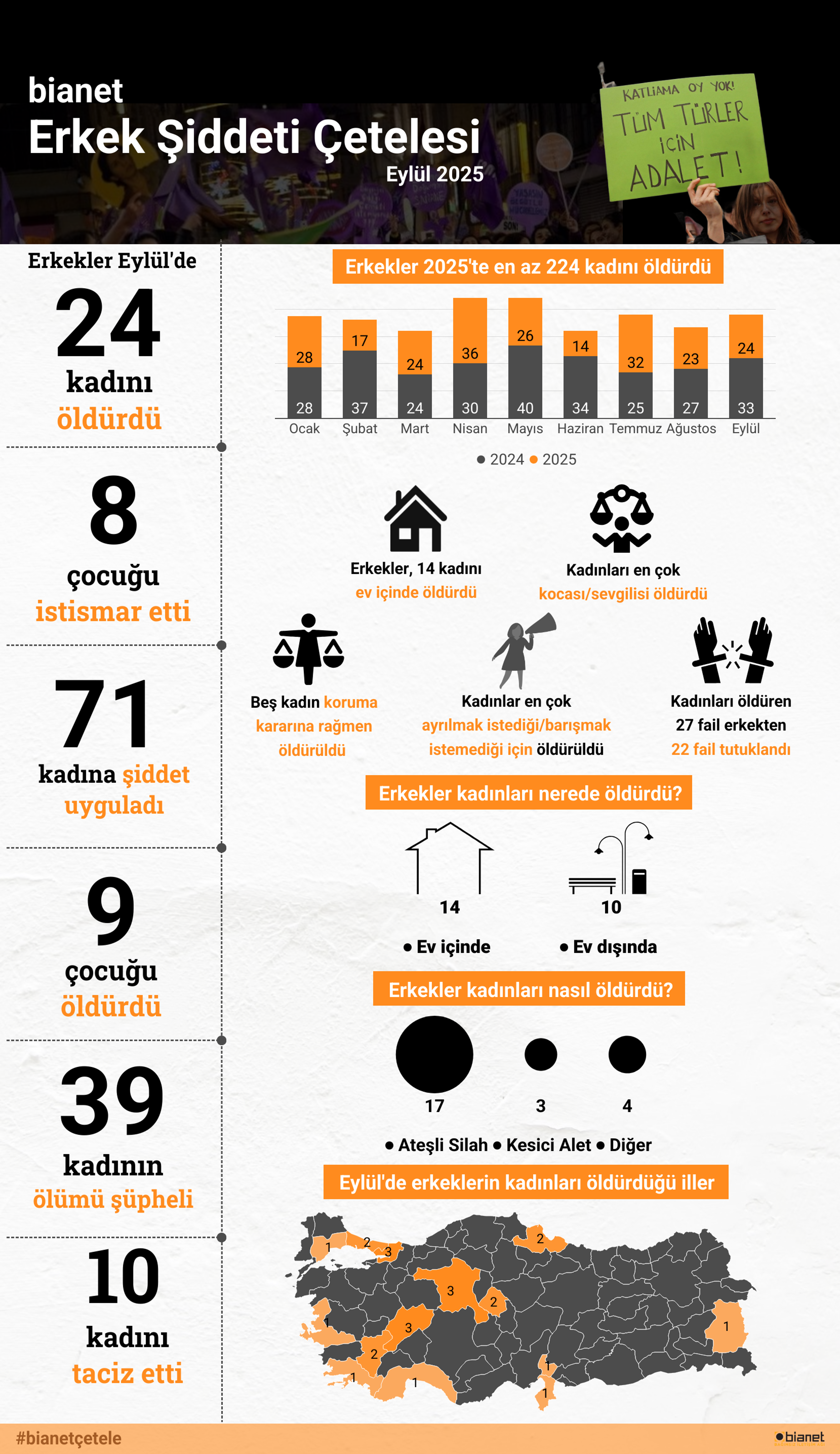 2025’in ilk dokuz ayında erkekler 224 kadını öldürdü, 164 kadını taciz etti, 169 çocuğu istismar etti, 561kadına şiddet uyguladı, sekiz kadına tecavüz etti. Erkekler en az 805 kadını seks işçiliğine zorladı. 347 kadının ölümü basına "şüpheli" olarak yansırken, erkekler, en az 51 çocuğu öldürdü.