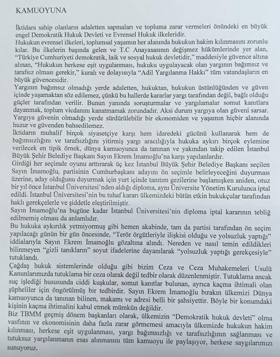 Hikmet Çetin, Ahmet Hüsamettin Cindoruk, Cahit Karakaş ve Mustafa Kalemli tarafından ortak kaleme alınan bildiride, "Ekrem İmamoğlu bırakın ülkemizi dünya kamuoyunca da tanınan bilinen, makamı ve adresi belli bir şahsiyettir. Böyle bir konumdaki kişinin kaçma ihtimalini kabul etmek mümkün değildir" ifadeleri kullanıldı.