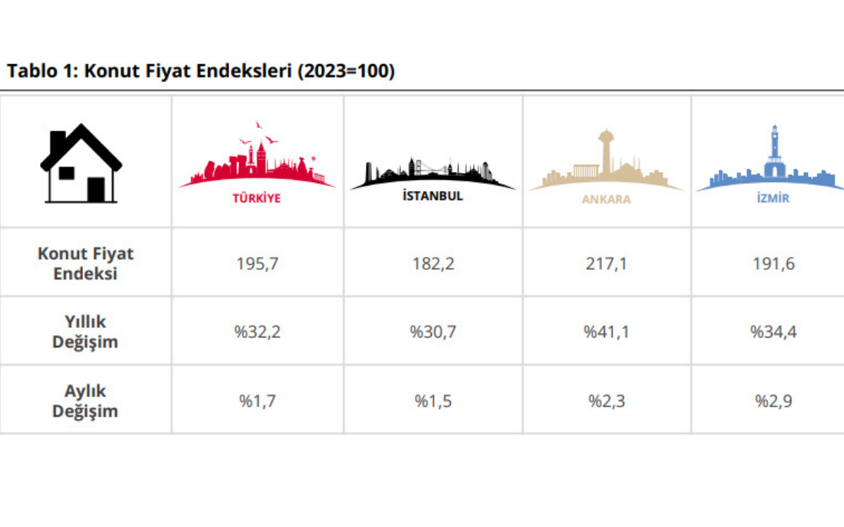 Endeks değerleri bir önceki yılın aynı ayına göre İstanbul, Ankara ve İzmir’de sırasıyla yüzde 30,7, 41,1 ve 34,4 oranlarında artış gösterdi.