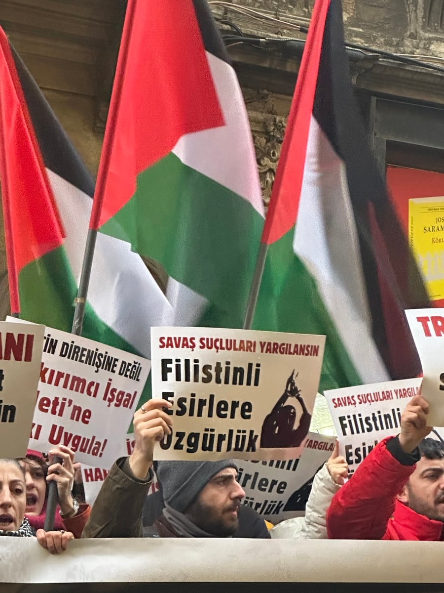 Protesto boyunca “Gazze Filistin halkınındır”, “Siyonizme geçit yok, İsrail’e boykot” ve “Yaşasın küresel intifada” sloganları atıldı.
