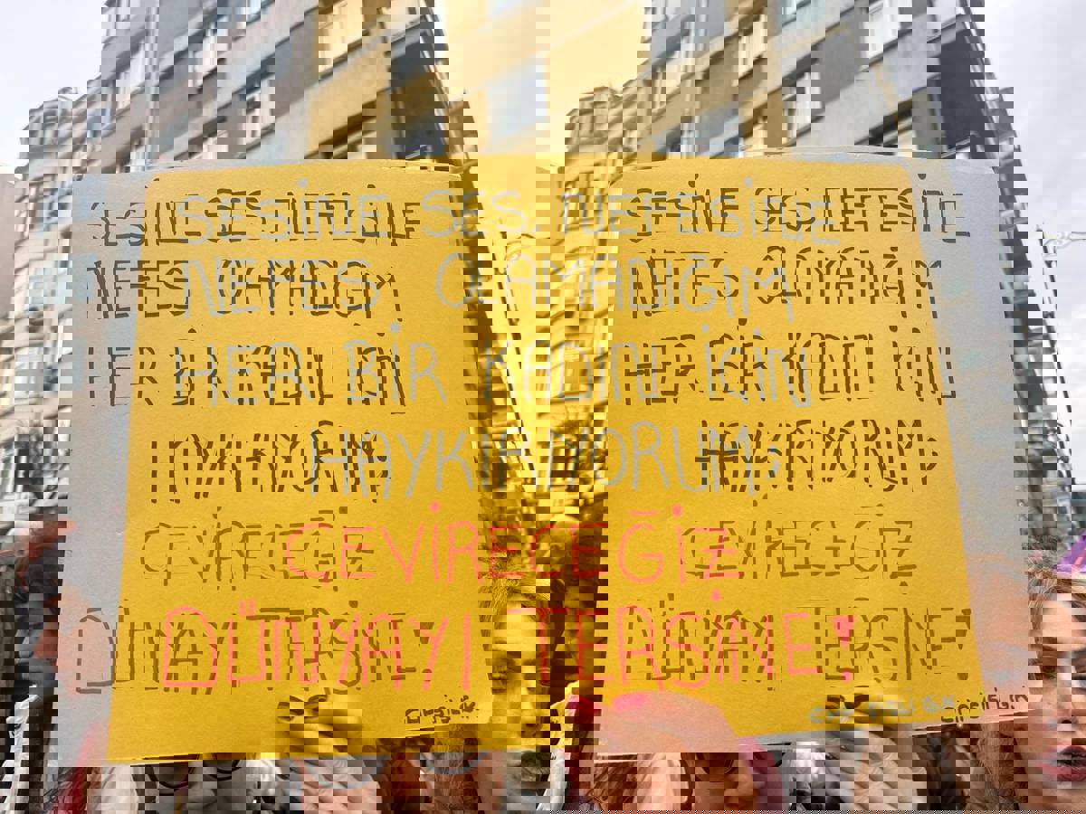 Yürüyüş boyunca “Göçmen kadınlar yalnız değildir”, “Koruma, aklama, failleri yargıla”, “Erkek vuruyor devlet koruyor”, “Susmuyoruz, korkmuyoruz, itaat etmiyoruz”, “Erkek adalet değil gerçek adalet” sloganları atıldı.