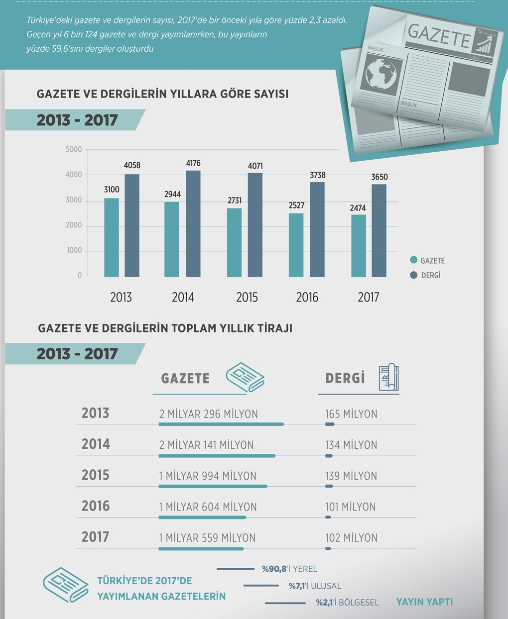 2017'de gazete ve dergilerin tirajı ise 2016'ya göre yüzde 2,6 azaldı. Türkiye'de 2017'de yayımlanan gazete ve dergilerin yıllık toplam tirajı, 1 milyar 661 milyon 102 bin 580. Toplam tirajı yüzde 93,9'unu gazeteler oluşturuyor.