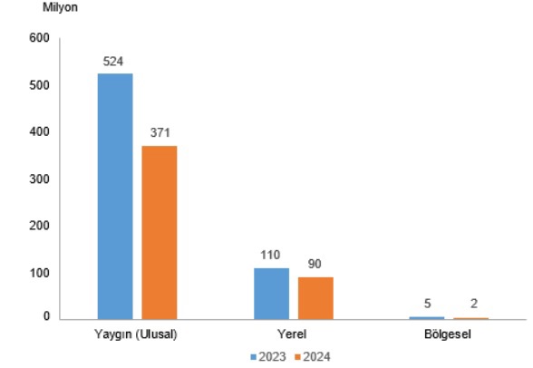 Bu gazetelerin toplam yıllık tirajı geçen yıl 2023’e göre yüzde 27,5 azalışla 462 milyon 707 bin 383 olurken, tirajın yüzde 80,1’ini yaygın gazeteler aldı.